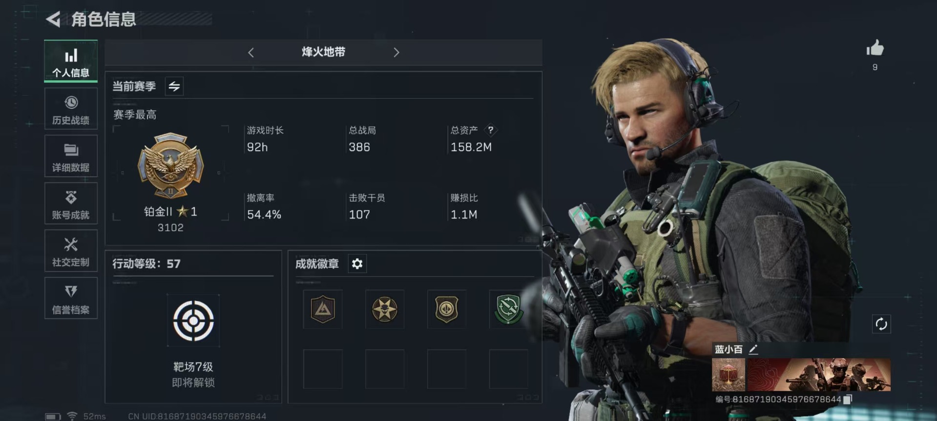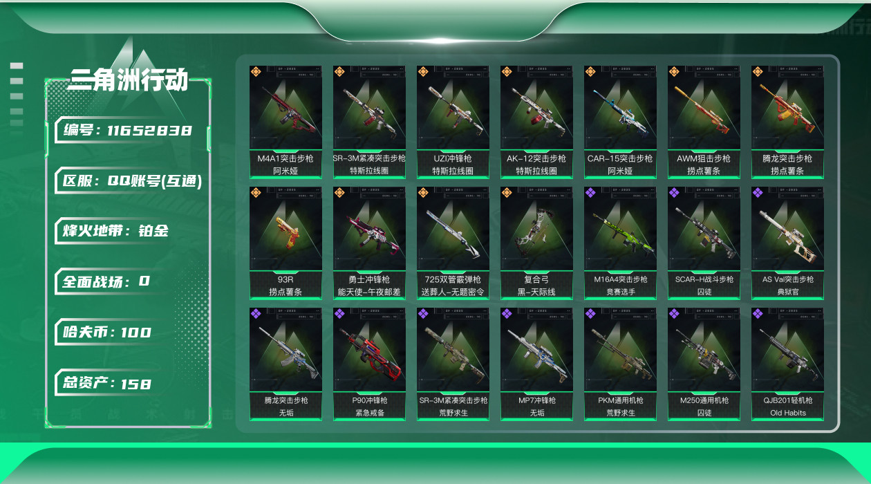 [11652838]总资产:158.2M 1干员外观 11传说枪械 哈夫币:100 高级安全箱(2×3)9.15号到期 可二次 可修改实名 烽火地带段位:铂金 全面战场段位:无段位 传说武器皮肤:UZI冲锋枪-特斯拉线圈,AWM狙击步枪-捞点薯条,腾龙突击步枪-捞点薯条,93R-捞点薯条,AK-12突击步枪-特斯拉线圈,SR-3M紧凑突击步枪-特斯拉线圈,勇士冲锋枪-能天使-午夜邮差,复合弓-黑-天际线,725双管霰弹枪-送葬人-无题密令,M4A1突击步枪-阿米娅,CAR-15突击步枪-阿米娅 史诗武器皮肤:QJB201轻机枪-Old Habits,M16A4突击步枪-竞赛选手,M250通用机枪-囚徒,AS Val突击步枪-典狱官,SCAR-H战斗步枪-囚徒,腾龙突击步枪-无垢,MP7冲锋枪-无垢,PSG-1射手步枪-无垢,SVD狙击步枪-荒野求生,SR-3M紧凑突击步枪-荒野求生,PKM通用机枪-荒野求生,沙漠之鹰-曙光,SVD狙击步枪-阿萨拉工艺,P90冲锋枪-紧急戒备 干员外观:蜂医-送葬人·无题密令(S5)