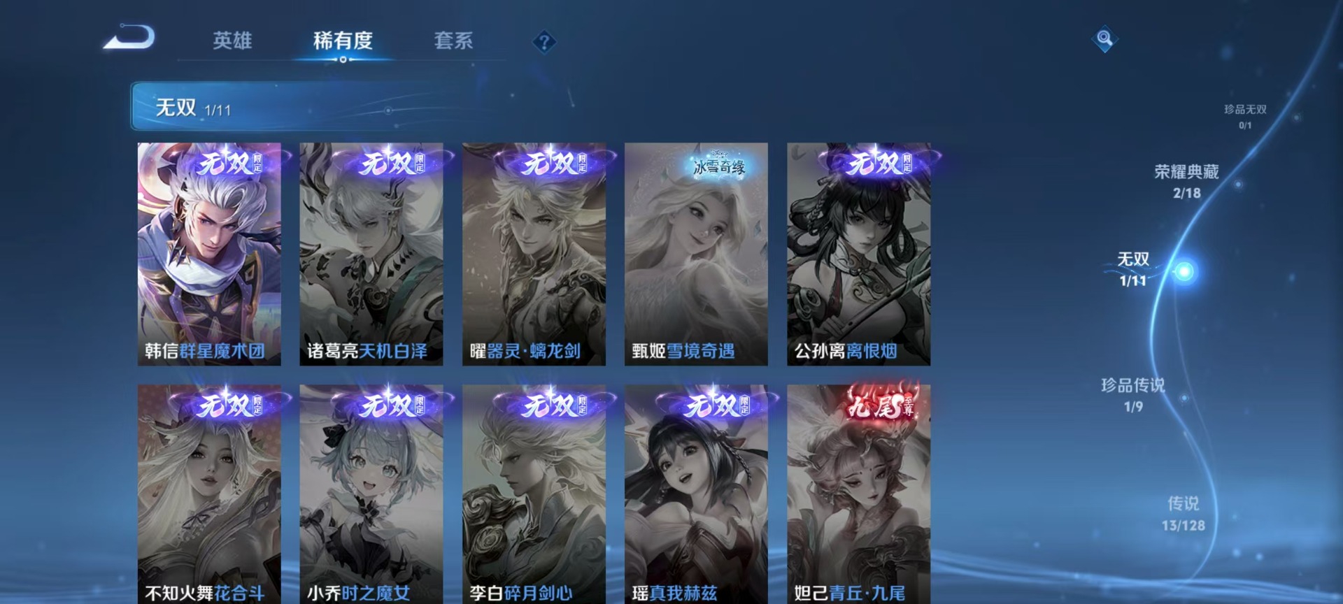 - PX_2080803-69 安卓QQ/最强王者/196皮肤/123英雄/1典藏/0珍品无双/0无双/0珍品传说/11传说/48史诗/8稀有英雄 【1 典藏皮肤】最初的交响 伽罗, 【11 传说皮肤】逐花归海 澜,凤求凰 李白,惊梅引 宫本武藏,山海·炽霜斩 李信,冠军飞将 花木兰,玄雷天君 嬴政,幻光神枪 云缨,愿照·山河定 司空震,愿照·岁时盈 虞姬,愿照·千秋盛 女娲,鸣野蒿 桑启, 【48