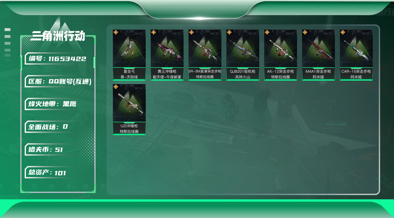 [11653422]总资产:101.7M 8传说枪械 哈夫币:51.196K进阶安全箱(9.17到期) 可二次 可修改实名 烽火地带段位:黑鹰 全面战场段位:无段位 传说武器皮肤:QJB201轻机枪-风林火山,UZI冲锋枪-特斯拉线圈,AK-12突击步枪-特斯拉线圈,SR-3M紧凑突击步枪-特斯拉线圈,勇士冲锋枪-能天使-午夜邮差,复合弓-黑-天际线,M4A1突击步枪-阿米娅,CAR-15突击步枪-阿米娅
