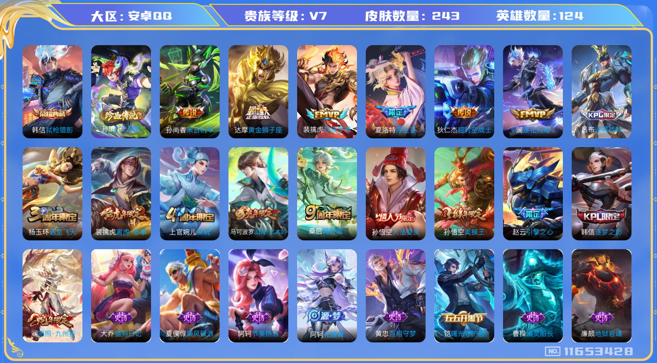 [11653428]V7 1典藏 1珍品传说 9传说 124英雄 243皮肤 可修改实名 优质装备:弑枪猎影(韩信典藏),黄金狮子座,末日机甲-孙尚香(绿蚂蚱),超时空战士-狄仁杰,浮生妄,澜逐花归海 珍品传说:时之奇旅-孙策 传说皮:祥瑞亨通 珍宝阁皮:妄想食味 限定皮:愿照·九州拓(澜年限),逐霄战戟,鸣野蒿,遇见飞天,梁祝,逐梦之影,大圣娶亲,引擎之心,美猴王,寅虎·赤拳(老虎年限),山海·玄木吟(马可年限) 史诗皮:鸭鸭历险记-刘禅,器灵·浮梦炉,绮世丹青,化蝶舞,星界战将,龙之律动,雪豹·霜爪,石田雨龙,茶境仙,破空之剑,蒙犽顽岩魄,百相守梦-百里守约,百相守梦-黄忠,白龙吟,黄金分割率,千年之狐,晚萤,末日机甲-吕布,猫狗日记-孙策,猫狗日记-大乔,乱世虎臣,节奏热浪,修罗,水果甜心,绅士熊喵,天才门将,星夜王子,幽灵船长,鬼剑武藏,天秀·启明,地狱岩魂,纤云弄巧,缤纷独角兽,乘风破浪,水晶猎龙者,曙光守护者,原初追逐者,圣诞狂欢,鹰眼统帅,魅力维加斯,未来纪元-赵云