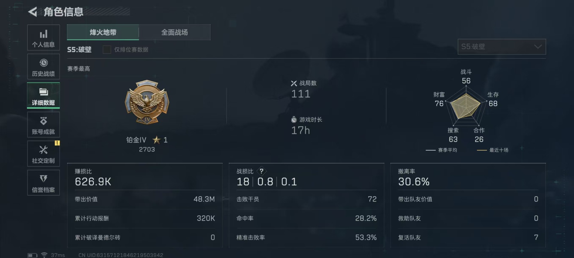 - [11681460]总资产:264.7 1干员外观 2近战传说 11传说枪械 顶级安全箱(9.17到期) 可二次 可修改实名 烽火地带段位:钻石 全面战场段位:上等兵 哈夫币:40.169 传说武器皮肤:近战-黑海,近战-北极星,SMG45冲锋枪-骑士,QJB201轻机枪-黑海,MP5冲锋枪-黑海,复合弓-黑-天际线,CAR-15突击步枪-阿米娅,725双管霰弹枪-送葬人-无题密令,QCQ171冲锋枪-北极星,K437突击步枪-北极星,G18-飞虎 史诗武器皮肤:M700狙击步枪-守夜人,Ash-12战斗步枪-守夜人,SR-3M紧凑突击步枪-荒野求生,SG552突击步枪-深海恐惧,SVD狙击步枪-暗夜猎手,M16A4突击步枪-竞赛选手,SVD狙击步枪-荒野求生,M14射手步枪-禁卫,M1014霰弹枪-林中猎手,SV-98狙击步枪-林中猎手,PSG-1射手步枪-无垢,AS Val突击步枪-典狱官,腾龙突击步枪-无垢,MP7冲锋枪-无垢,QCQ171冲锋枪-禁卫,QBZ95-1突击步枪-曙光,M700狙击步枪-竞技风 干员外观:红狼-蚀金玫瑰