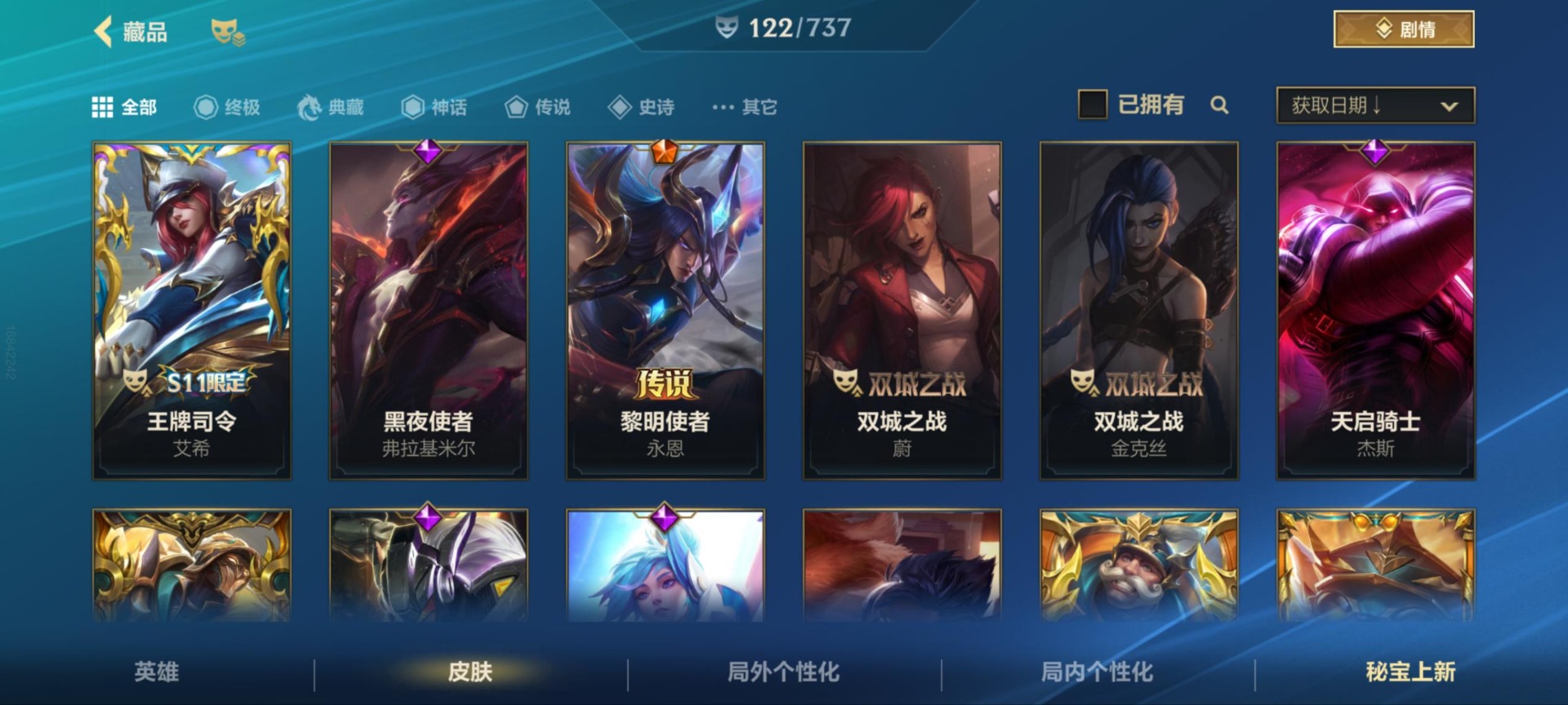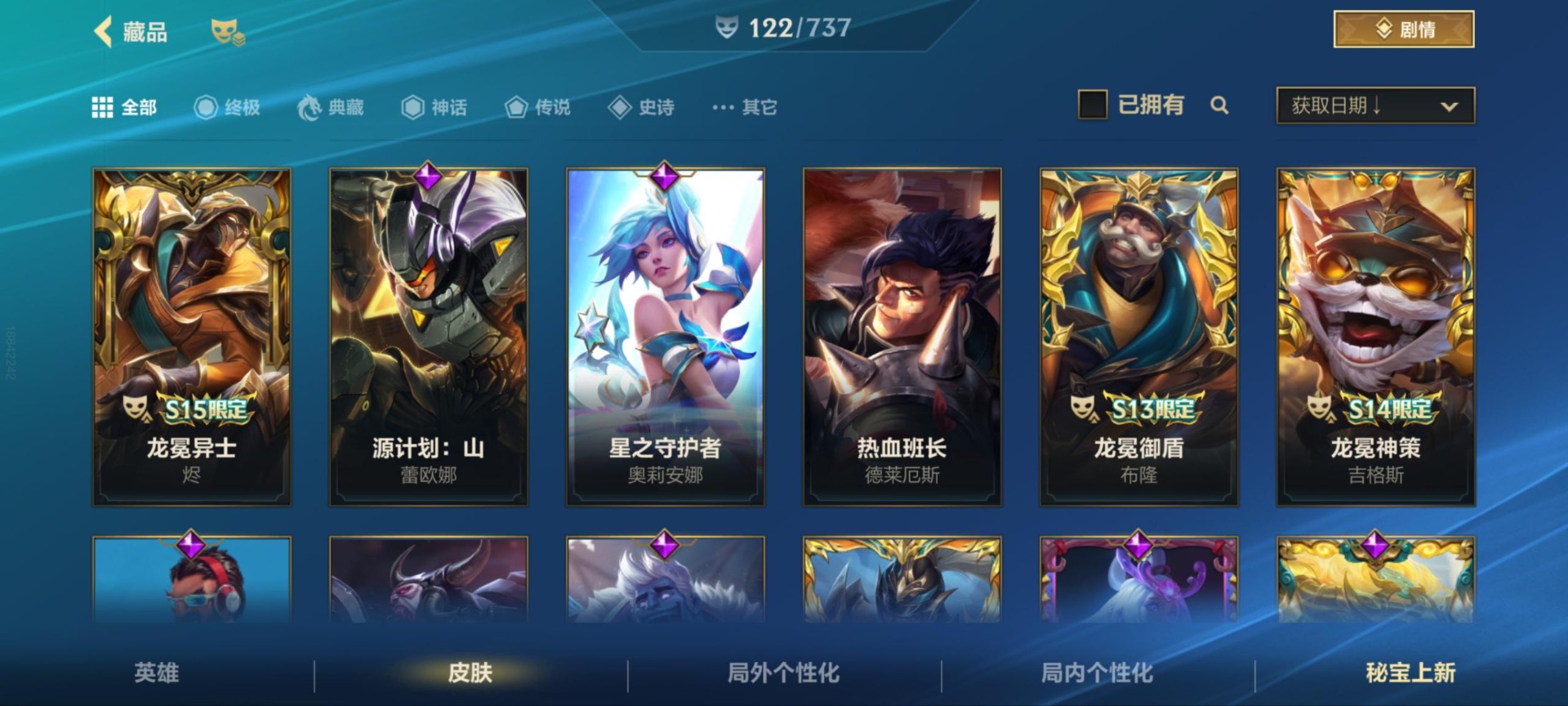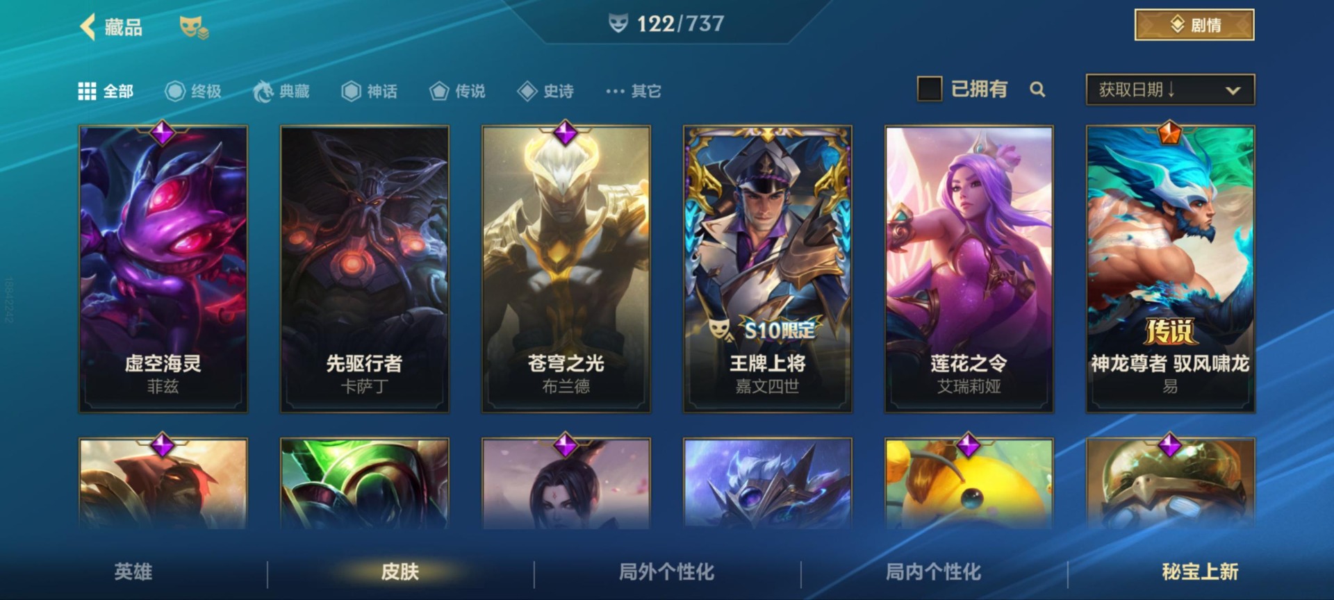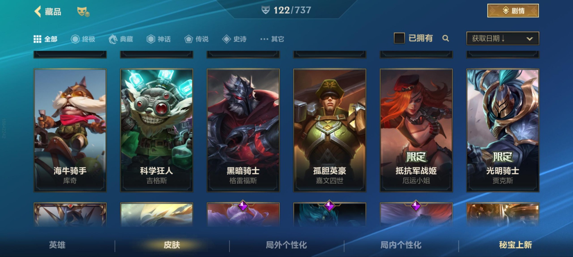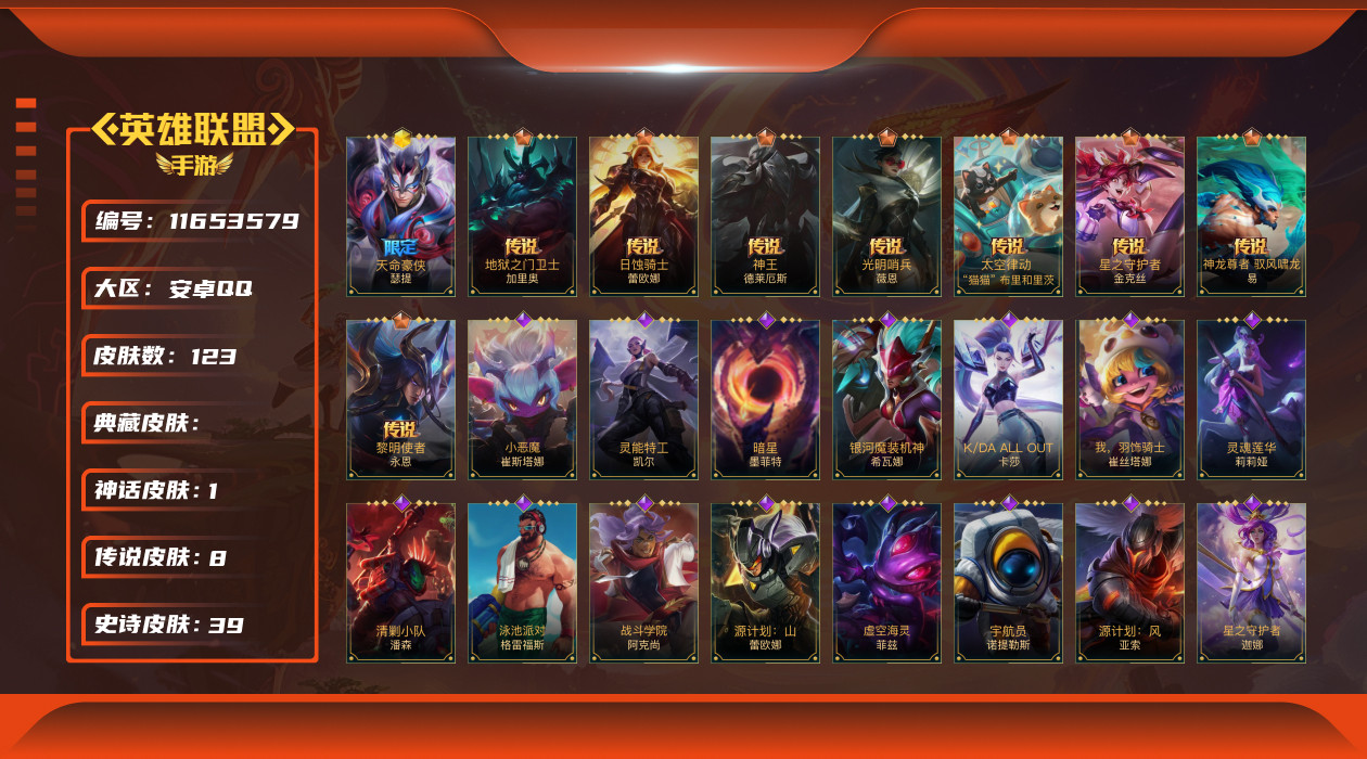 - PX_2057207-贵族等级: V7 英雄数: 124 皮肤数: 227 星传说: 零号·雷霆 传说皮: 炽阳神光,末日机甲-孙尚香,零号·赤焰,霜月吟,牧神诗旅,祥瑞亨通 限定皮: 冰锋战神,李小龙,御风骁将,神威,时之彼端,飞衡,天狼绘梦者,至尊宝,孙行者,鸣野蒿,逐霄战戟,愿照·九州拓