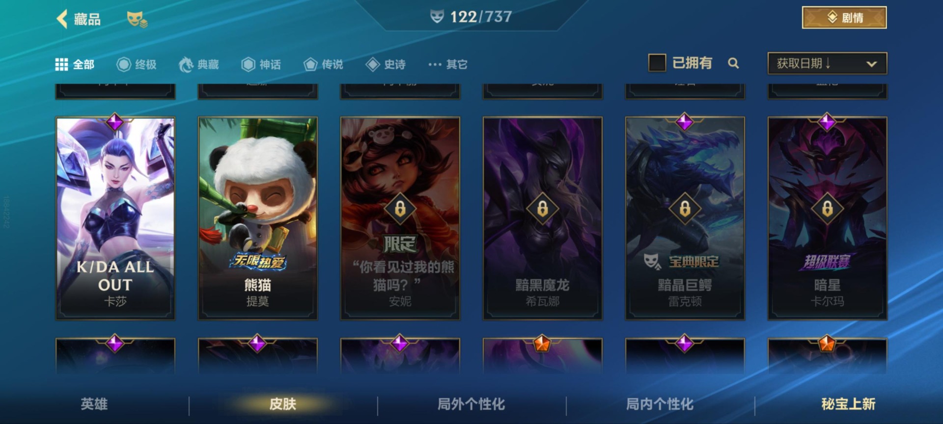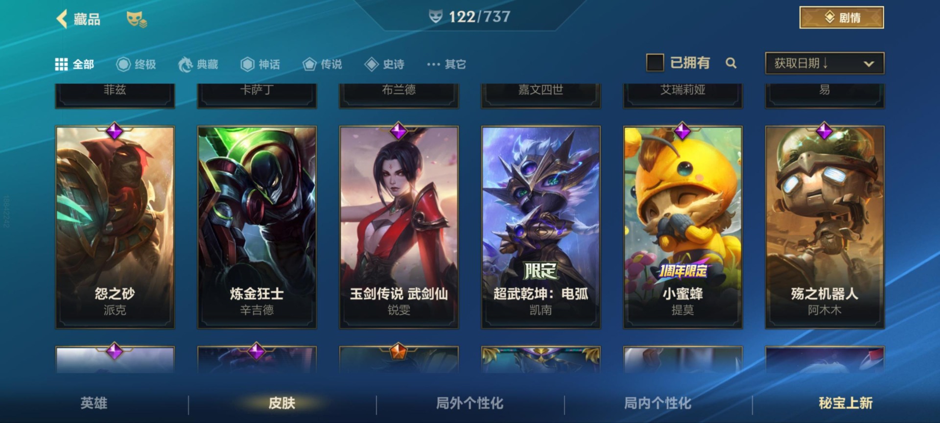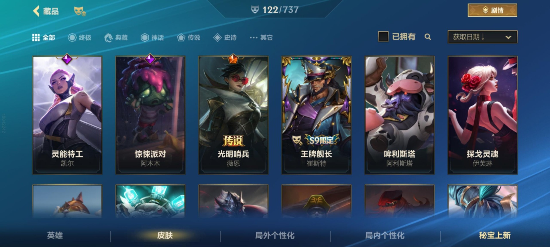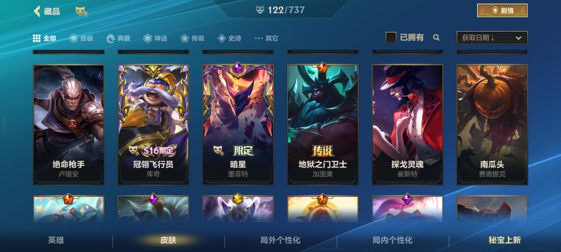 - PX_2057207-贵族等级: V7 英雄数: 124 皮肤数: 227 星传说: 零号·雷霆 传说皮: 炽阳神光,末日机甲-孙尚香,零号·赤焰,霜月吟,牧神诗旅,祥瑞亨通 限定皮: 冰锋战神,李小龙,御风骁将,神威,时之彼端,飞衡,天狼绘梦者,至尊宝,孙行者,鸣野蒿,逐霄战戟,愿照·九州拓