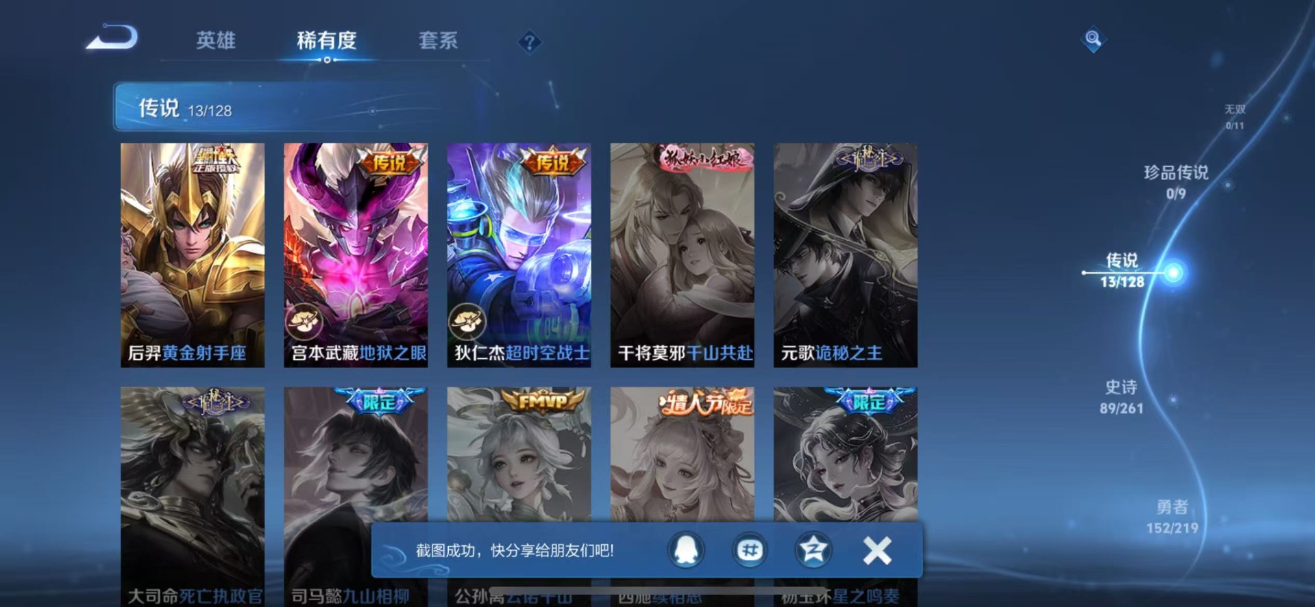 - [11686503]V6 4传说 123英雄 165皮肤 可修改实名 优质装备:一念神魔,地狱火,山海·苍雷引(电光曜子) 珍宝阁皮:妄想食味,蔷薇恋人 限定皮:鸣野蒿,傲雪梅枪,高山流水,五谷丰年,冰锋战神,奔雷神使(牛魔年限),李小龙,朱雀志(守约年限),孙行者,猪悟能,大圣娶亲 史诗皮:电玩小子(小书包),千年之狐,永昼,匿光破解者,电玩·爆裂旋风,暗夜猫娘,末日机甲-吕布,猫狗日记-孙策,乱世虎臣,修罗,水果甜心,天才门将,星夜王子,心灵骇客,鬼剑武藏,纤云弄巧,繁星吟游(呼啦呼啦),拒霜思,乘风破浪,逐浪之夏,水晶猎龙者,金属风暴,原初追逐者,鹰眼统帅,赏金猎手,未来纪元-赵云