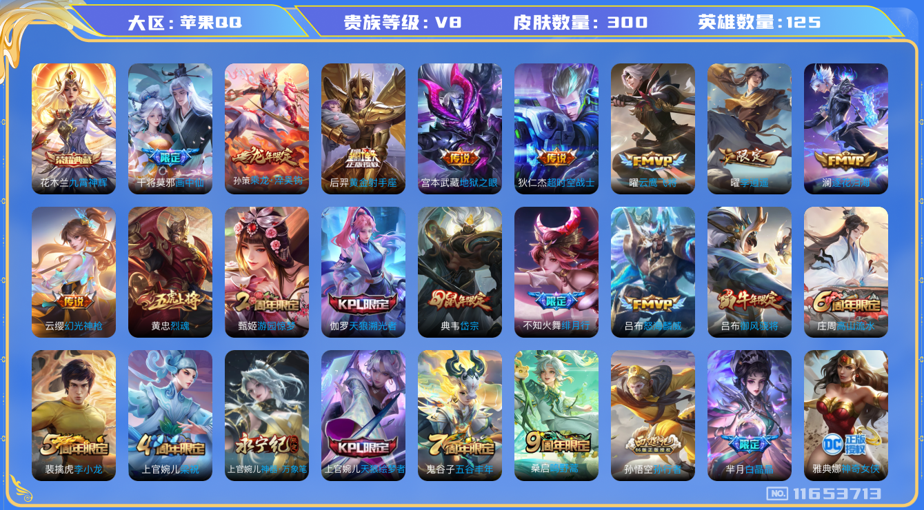 [11653713]V8 1典藏 13传说 125英雄 300皮肤 可修改实名 优质装备:九霄神辉(木兰典藏),黄金射手座,云鹰飞将(小将军),地狱之眼,李逍遥,超时空战士-狄仁杰,画中仙,澜逐花归海,涂山容容 传说皮:乘龙·淬吴钩(孙策年限),幻光神枪 珍宝阁皮:妄想食味,蔷薇恋人,女武神 限定皮:鸣野蒿,绯月行,白晶晶,飞衡(韩信年限),高山流水,怒海麟威,降魔,五谷丰年,游园惊梦,梁祝,御风骁将(吕布年限),烈魂,岱宗(典韦年限),天狼溯光者,天狼绘梦者,李小龙,孙行者,神奇女侠,时之奇旅-妲己,神器·万象笔 史诗皮:化蝶舞,龙之律动,石田雨龙,百相守梦-黄忠,苍穹之光,电玩小子(小书包),黄金分割率,特工魅影,千年之狐,江河有灵,雪夜绮愿(周瑜),真我赫兹(百里守约),百解令(蒙犽),高渐离燃音魔法,无限星赏官,匿光破解者,冰冠公主,青蛇,偶像歌手,电玩·爆裂旋风,百相守梦(刘备),末日机甲-吕布,猫狗日记-孙策,猫狗日记-大乔,时之恋人-孙尚香,乱世虎臣,节奏热浪,女仆咖啡,水果甜心,绅士熊喵,天才门将,星夜王子,心灵骇客,时之奇旅-安琪拉,功夫厨神,德古拉伯爵,暗隐猎兽者,幽灵船长,鬼剑武藏,心灵战警,舞动绿茵,地狱岩魂,纤云弄巧,繁星吟游(呼啦呼啦),拒霜思,缤纷独角兽,乘风破浪,逐浪之夏,月团寄思,水晶猎龙者,曙光守护者,箭羽风息,金属风暴,圣诞狂欢,圣诞恋歌,鹰眼统帅,暗夜贵公子,魅力维加斯,天秀·音浪,无心,未来纪元-赵云