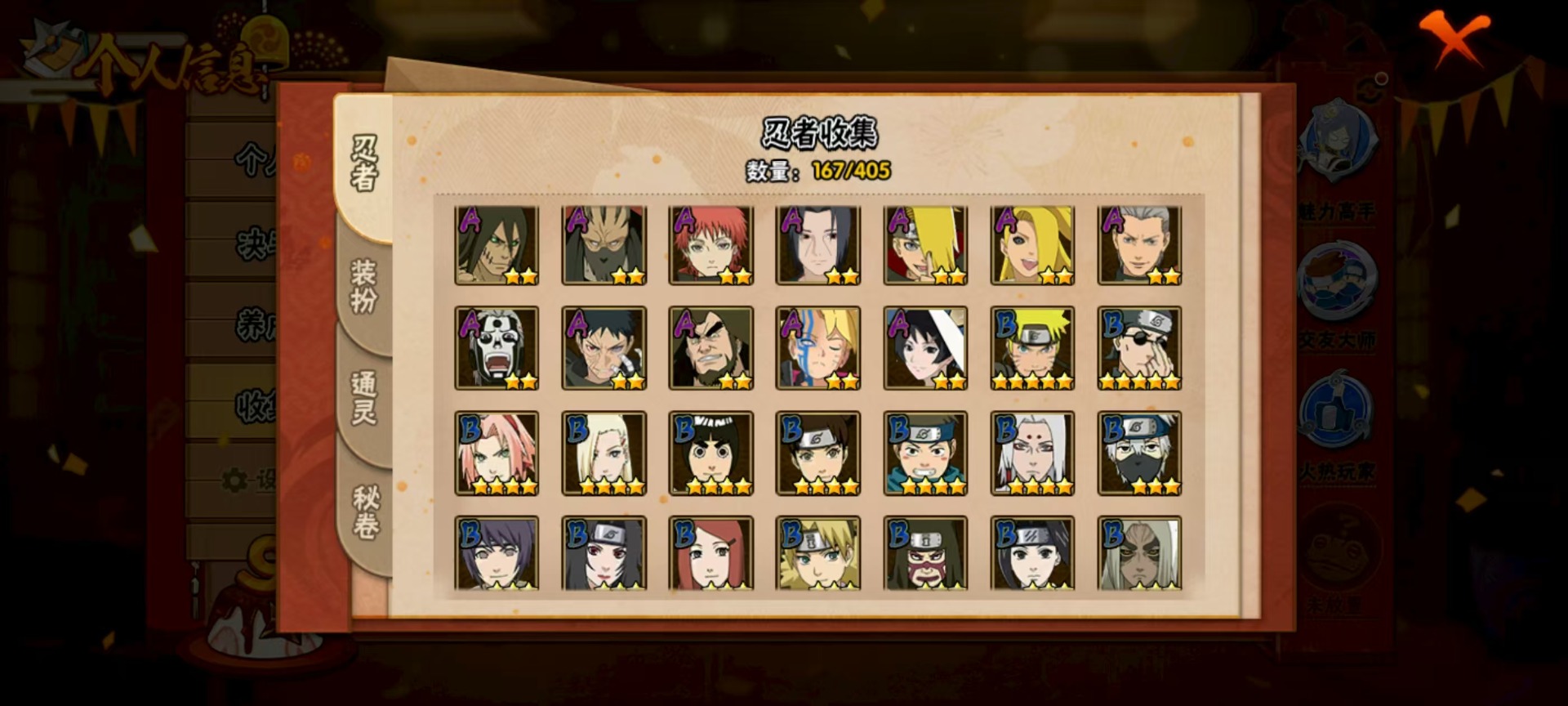 - [11296995],贵族等级 V10 S忍数 12 A忍数 31 时装数 12 战力值(万) 6312058 S级忍者(12) 佩恩「天道」,大蛇丸,波风水门,宇智波鼬 「须佐能乎」,自来也 「舞之豪杰」,漩涡鸣人 「九喇嘛连结」,春野樱 「忍界大战」,宇智波佐助「永恒万花筒」,大筒木桃式,艾「忍界大战」,自来也 「传说中的三忍」,漩涡鸣人 「暴怒·第六尾」 三星S(12) 佩恩「天道」,大蛇丸,波风水门,宇智波鼬 「须佐能乎」,自来也「舞之豪杰」,漩涡鸣人 「九喇嘛连结」,春野樱 「忍界大战」,宇智波佐助「永恒万花筒」,大筒木桃式,艾「忍界大战」,自来也 「传说中的三忍」,漩涡鸣人 「暴怒·第六尾」 四星A(1) 迈特凯 三星A(5) 飞段,我爱罗「疾风传」,蝎,猿飞阿斯玛,干柿鬼鲛 二星A(25) 黑土「四代目土影」,宇智波佐助「须佐能乎」,迪达拉「秽土转生」,小南「新春限定」,千代「近松十人卫」,药师兜「半蛇斗篷」,秋道丁次「忍界大战」,大蛇丸「晓」,照美冥「五代目水影」,宇智波佐助「万花筒写轮眼」,飞段「死司凭血」,宇智波鼬,波风水门 「青年」,艾 「青年」,长门「青年」,长十郎「六代目水影」,