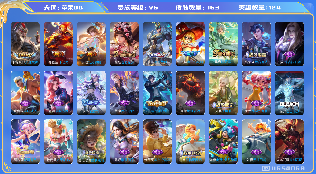 [11654068]V6 4传说 124英雄 163皮肤 可修改实名 优质装备:久胜战神,地狱火 传说皮:幻光神枪 珍宝阁皮:女武神 限定皮:逐霄战戟,鸣野蒿,魔法小厨娘,游园惊梦 史诗皮:鸭鸭历险记-刘禅,化蝶舞,龙之律动,石田雨龙,茶境仙,蒙犽顽岩魄,蔬乡物语(鲁班七号),百相守梦-黄忠,紫霞仙子,黄金分割率,千年之狐,江河有灵,高渐离燃音魔法,冰冠公主,电玩·爆裂旋风,节奏热浪,女仆咖啡,摇滚巨星,水果甜心,天才门将,功夫厨神,德古拉伯爵,暗隐猎兽者,鬼剑武藏,天秀·启明,地狱岩魂,纤云弄巧,缤纷独角兽,乘风破浪,曙光守护者,金属风暴,鹰眼统帅,魅力维加斯,赏金猎手,未来纪元-赵云