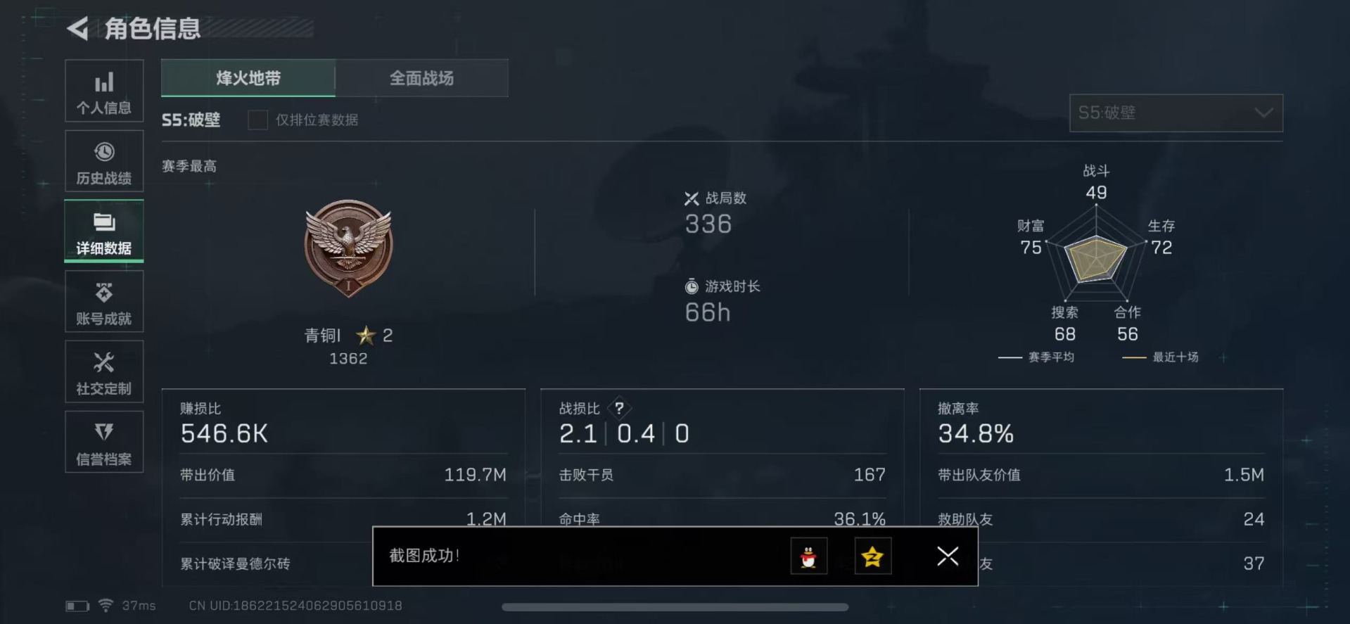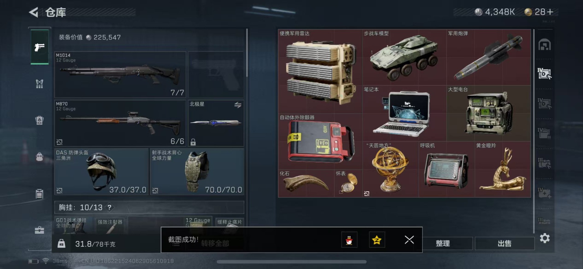 [11654184]总资产:79.6M 1近战传说 10传说枪械 哈夫币:4.348K 高级安全箱(9.16到期) 可二次 可修改实名 优质装备:近战-北极星 烽火地带段位:青铜 全面战场段位:列兵 传说武器皮肤:UZI冲锋枪-特斯拉线圈,AK-12突击步枪-特斯拉线圈,勇士冲锋枪-能天使-午夜邮差,复合弓-黑-天际线,K437突击步枪-北极星,QCQ171冲锋枪-北极星,725双管霰弹枪-送葬人-无题密令,M4A1突击步枪-阿米娅,CAR-15突击步枪-阿米娅 史诗武器皮肤:PKM通用机枪-蝮蛇,M1014霰弹枪-林中猎手,AKM突击步枪-林中猎手,M250通用机枪-囚徒,SV-98狙击步枪-林中猎手,PTR-32突击步枪-英雄,AS Val突击步枪-典狱官,SCAR-H战斗步枪-囚徒,腾龙突击步枪-无垢,MP7冲锋枪-无垢,SVD狙击步枪-荒野求生,SR-3M紧凑突击步枪-荒野求生,PKM通用机枪-荒野求生,Vector冲锋枪-阿萨拉文明,M700狙击步枪-竞技风