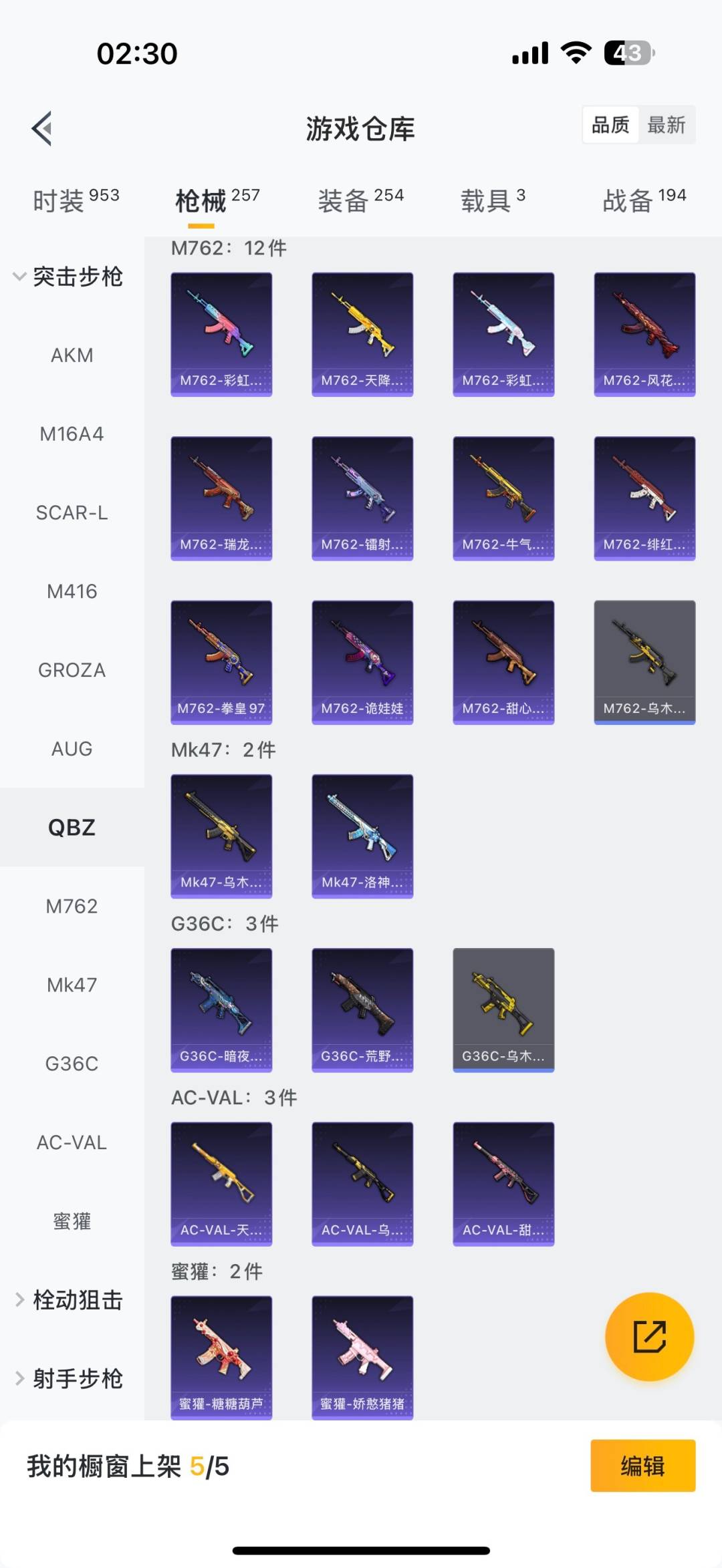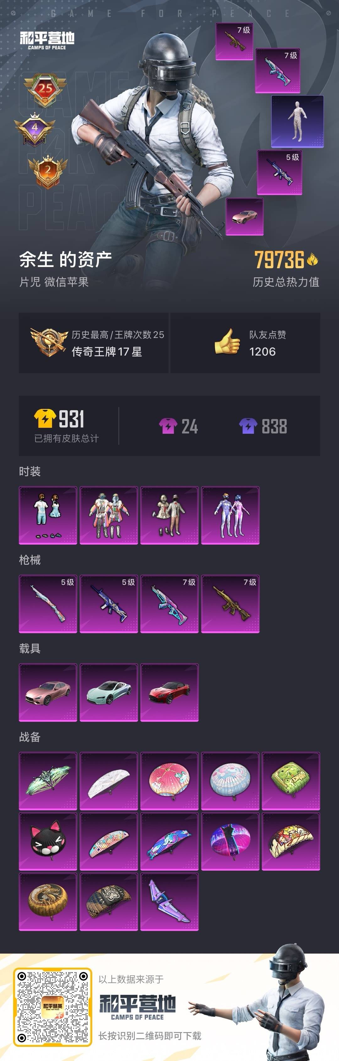 - PX_2106739- 苹果手Q-4王牌印记-有战神框-5粉装-8特效枪-3载具-30722热力值-56套装-80枪皮-1卓越印记-1传奇印记 【5粉装】,梦幻火箭,萨利娅,星梦奇缘,绚金战神,呆萌星弥 【8特效枪】AKM-魔法神域-3级 SCAR-L-甜梦小狐-4级 M416-电玩时刻-5级 M416-超新星-6级 M762-青锋波束-5级 Kar98K-巳巳如意-5级 M24-魔法神域-4级