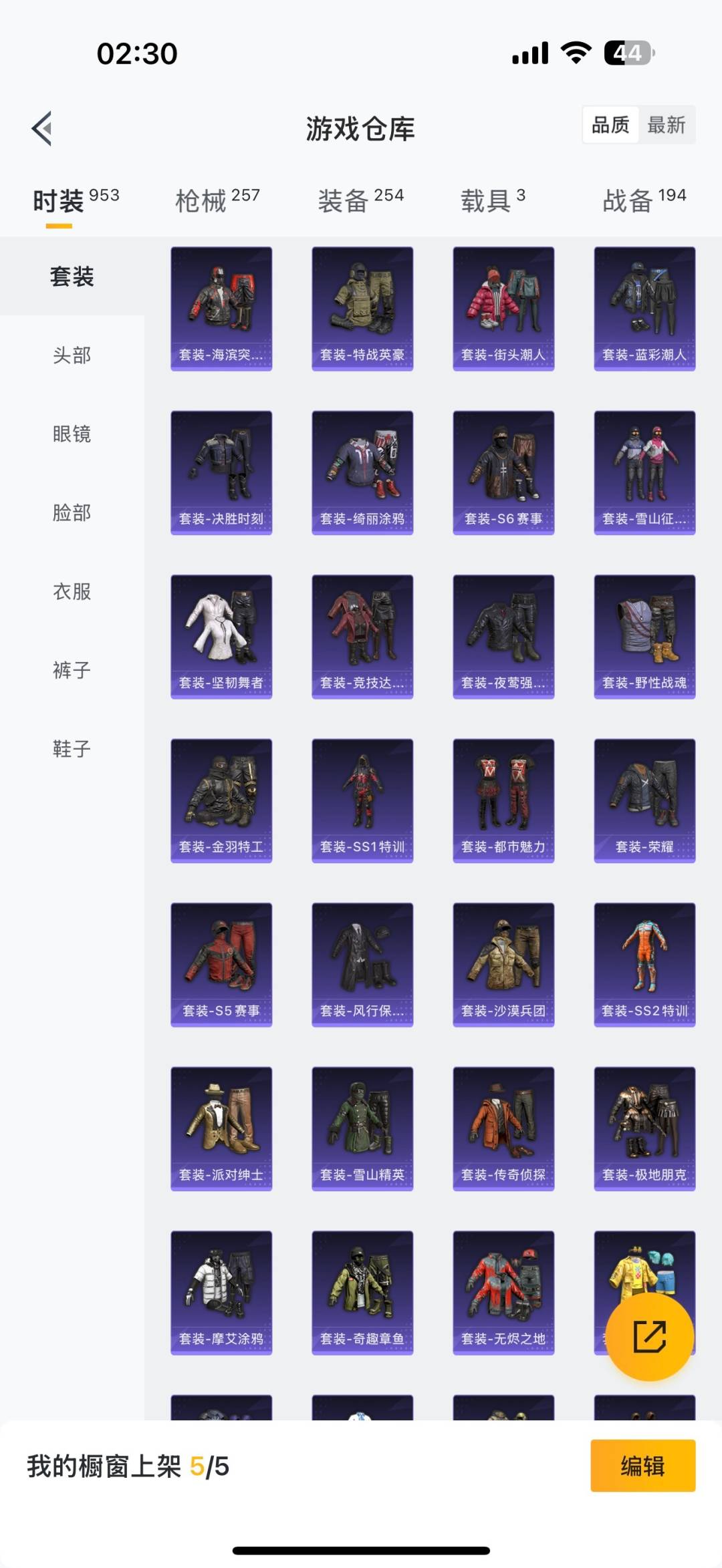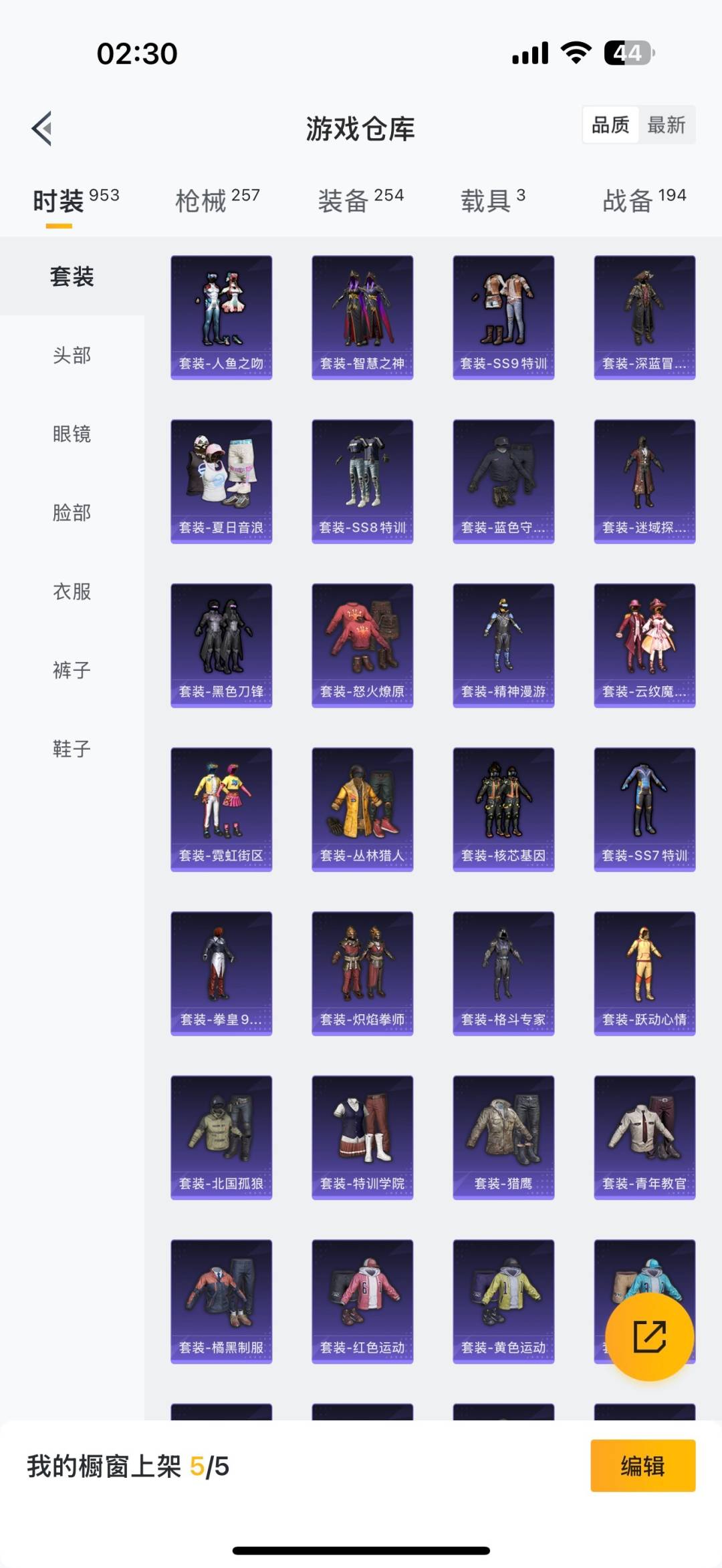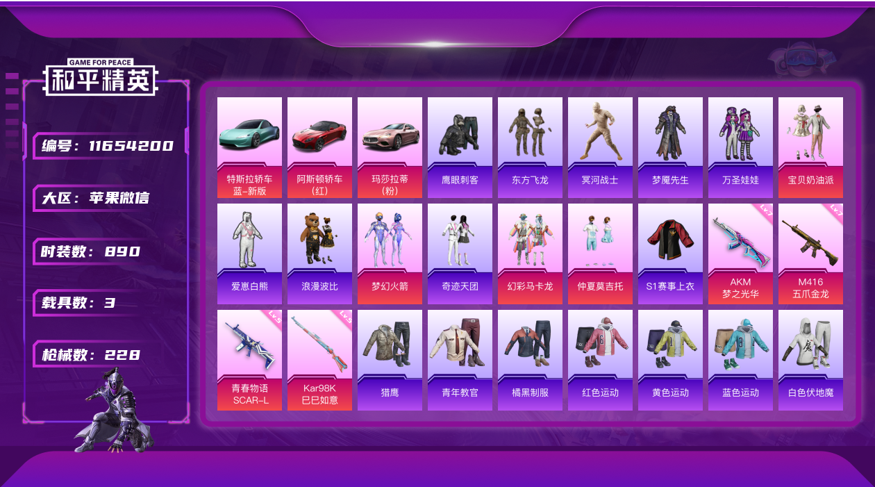 [11654200]4粉装 4特效枪 3载具 25印记 可二次 可修改实名 身法装备:暗影哥特(红眼罩),冥河战士(老木乃伊) 优质装备:冥河战士(老木乃伊),木乃伊套装(老)(冥河战士),玛莎拉蒂Ghibli(粉),阿斯顿·马丁DBS(红),特斯拉Roadster(水滴蓝),M416五爪金龙,梦幻火箭(新101)(新火箭少女101粉色套装),宝贝奶油派,幻彩马卡龙,AKM梦之光华,SCAR-L青春物语,七级AKM-梦之光华,七级M416-五爪金龙,Kar98K-巳巳如意 热门装扮:仲夏莫吉托,S1赛事上衣,奇迹天团,鹰眼刺客,万圣娃娃,梦魇先生,爱崽白熊,东方飞龙,浪漫波比 五级特效枪:五级Kar98K-巳巳如意,五级SCAR-L-青春物语 紫色装扮:田园牧歌,轻风白浪,和煦暖阳,SS22特训,SS23特训,白兰地假日,娇憨猪猪,萌趣咩咩,暖心熊熊,SS21特训,SS31特训套装,S6赛事,SS2特训,SS3特训,SS4特训,SS5特训,六六大吉,军械专家,冰川特警,决胜时刻,冷焰舞者,凛冬战士,刚毅裁决者,北国孤狼,千禧之恋,午夜朋克,S5赛事,SS30特训套装,SS20特训,SS15特训,SS16特训,爆裂葡萄,银白舞王,SS13特训,SS14特训,萌趣颜团子,特种颜团子,飞驰魅影,音速流光,SS19特训,军刀雅典娜,吉莉礼服,虚音幻奏,瑞龙福将,团圆交子,醒狮腾龙,SS17特训,异彩先驱,SS18特训,阳光火鸡,都市漫游者,都市魅力,酷潮明星,野性战心,野性战魂,金鼠迎春,长空猛禽,雪山征服者,雪山精英,雷霆特警,霓虹极客,霓虹街区,青年教官,迎春赐吉,风暴特警,缤纷果语,耀眼新星,苍穹猎鹰,荣耀,蓝彩潮人,蓝色守护者,蓝色运动,虎虎生威吉莉,街头潮人,跃动心情,风行保卫者,飞行日记,骑行爱好者,鹤鸣,麻辣教官,黄色格斗者,黄色运动,黎明保卫者,黑色伏地魔,龙的传人,香桃花海,熔岩游骑兵连帽夹克,和平特警,沙漠毒蛇,朋克之心,极地朋克,极速红龙,柠萌假日,格斗先锋,棕色飞行服,橘黑制服,沙漠兵团,派对绅士,海滨突袭者,滨海假日,圣诞大吉,坚韧舞者,夏日音浪,夜莺强袭者,完美偶像,帅气教官,时尚圣诞,怒火燎原,战地督导,战地菁英,探宝勇士,攀登者,湖蓝色名流,滨海厨神,绮丽涂鸦,甜蜜菠萝,疯狂小兔子,登山爱好者,白色伏地魔,碟中谍A款,神秘领域,甜蜜告白,游猎者,福星高照,