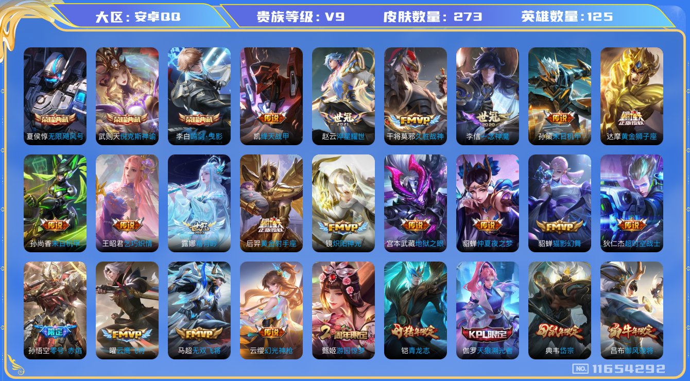 [11654292]V9 3典藏 28传说 125英雄 273皮肤 典藏英雄武则天 可修改实名 优质装备:倪克斯神谕(宇宙婆娘),无限飓风号(高达),鸣剑·曳影,黄金狮子座,黄金射手座,云鹰飞将(小将军),绛天战甲(鸡嘴战神),猫影幻舞,久胜战神,炽阳神光,一念神魔,末日机甲-孙尚香(绿蚂蚱),仲夏夜之梦(大飞蛾),零号·赤焰,地狱之眼,乞巧织情,淬星耀世,超时空战士-狄仁杰,末日机甲-孙策,无双飞将,霜月吟 传说皮:幻光神枪 珍宝阁皮:优雅恋人,蔷薇恋人,女武神 限定皮:愿照·山河定(司空震年限),鸣野蒿,至尊宝,白虎志(电光耗子),凤求凰(白切鸡),凤凰于飞,武陵仙君(小桃花),神威(电光马子),飞衡(韩信年限),高山流水,齐天大圣,五谷丰年,青龙志(铠年限),冰锋战神,武圣,游园惊梦,梁祝,御风骁将(吕布年限),岱宗(典韦年限),天狼溯光者,天狼绘梦者,李小龙,逐梦之影,朱雀志(守约年限),如梦令-后羿,默契交锋-花木兰,一生所爱,天魔缭乱,山海·玄木吟(马可年限) 史诗皮:星界战将,百相守梦-百里守约,百相守梦-黄忠,紫霞仙子,苍穹之光,电玩小子(小书包),白龙吟,黄金分割率,特工魅影,千年之狐,江河有灵,魅语,高渐离燃音魔法,蒙恬荣光圣徽,无限星赏官,冰冠公主,偶像歌手,电玩·爆裂旋风,龙骑士(小龙虾),末日机甲-吕布,猫狗日记-孙策,猫狗日记-大乔,乱世虎臣,节奏热浪,修罗,女仆咖啡,水果甜心,天才门将,星夜王子,心灵骇客,功夫厨神,德古拉伯爵,暗隐猎兽者,幽灵船长,鬼剑武藏,心灵战警,舞动绿茵,地狱岩魂,拒霜思,缤纷独角兽,乘风破浪,逐浪之夏,水晶猎龙者,曙光守护者,热力回旋,箭羽风息,金属风暴,原初追逐者,圣诞狂欢,圣诞恋歌,鹰眼统帅,魅力维加斯,黎明之约,赏金猎手,无心,未来纪元-赵云