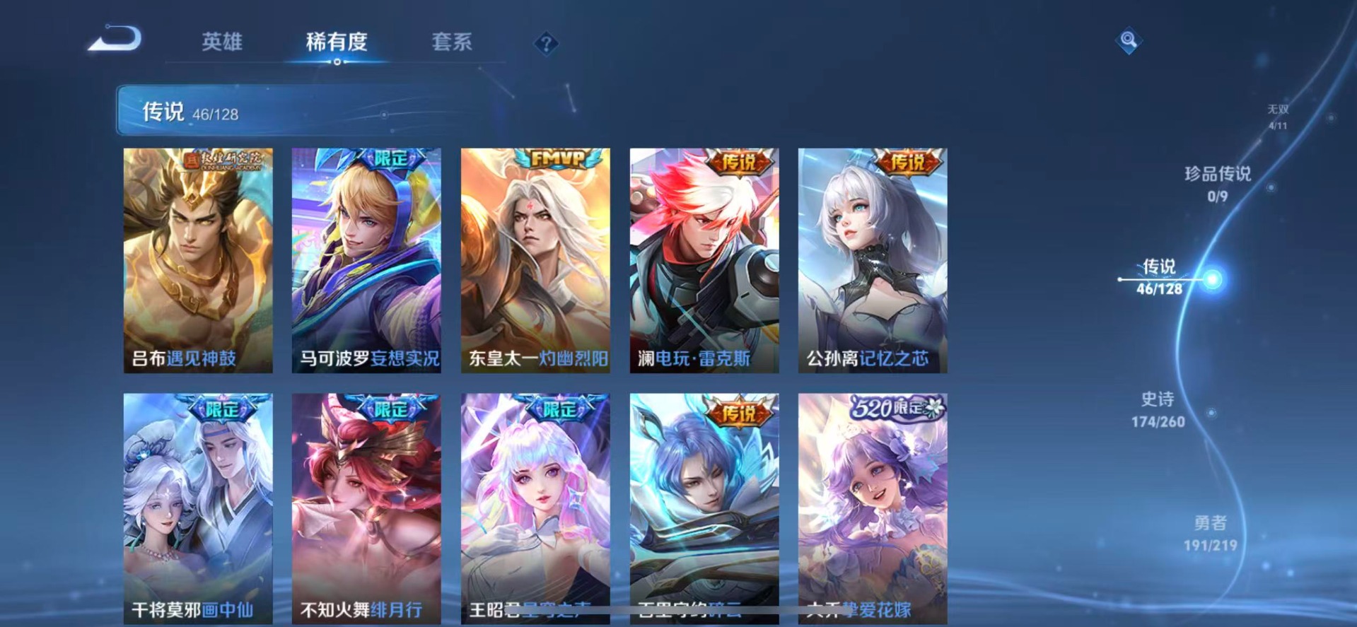 - PX_2084980-【金标吕布 金标司马懿 金标李信 金标狂铁】贵族等级: V4 英雄数: 122 皮肤数: 151 传说皮: 无双飞将,遇见神鼓,吕布曦玄引,祥瑞亨通,云诺千山 限定皮: 遇见飞天,五谷丰年,鸣野蒿,逐霄战戟
