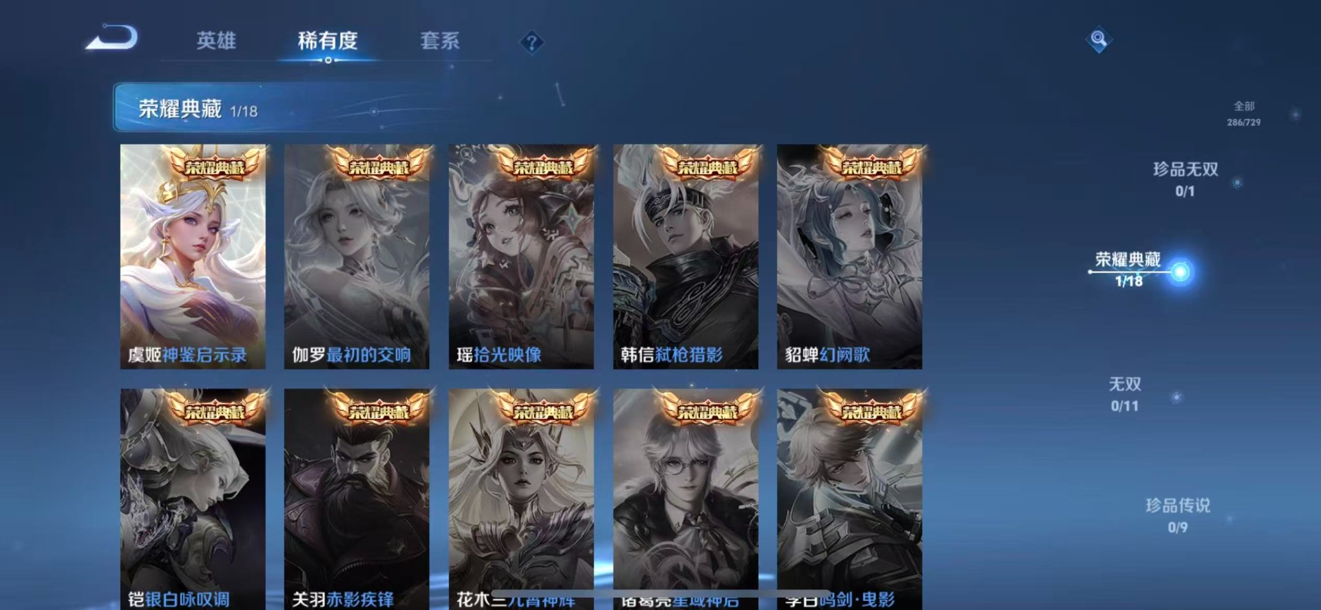曹操天狼征服者,伽罗天狼溯光者,孙尚香异界灵契,露娜一生所爱,诸葛亮时雨天司,裴擒虎李小龙,裴擒虎寅虎·赤拳,上官婉儿梁祝,上官婉儿神器·万象笔,花木兰默契交锋,马可波罗山海·玄木吟,孙悟空孙行者,孙悟空大圣娶亲,韩信傲雪梅枪,虞姬霸王别姬