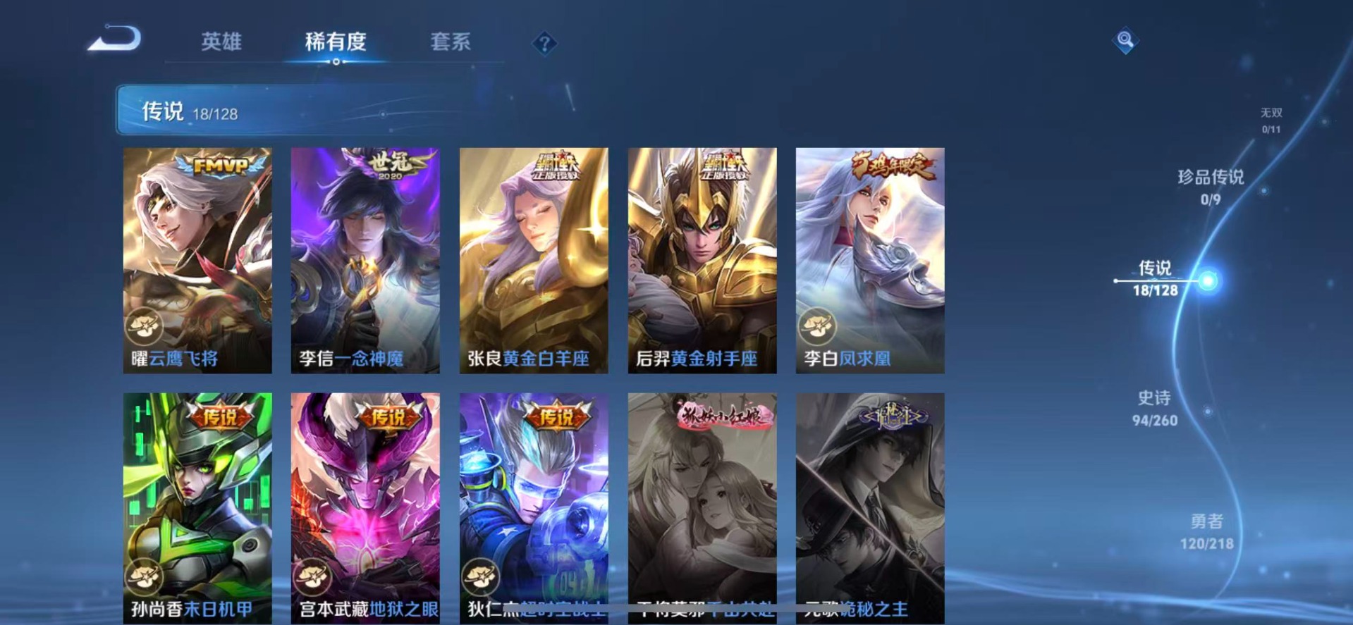 - [11432980]V7 4传说 119英雄 166皮肤 可修改实名 优质装备:猫影幻舞,末日机甲-孙尚香(绿蚂蚱),仲夏夜之梦(大飞蛾) 珍宝阁皮:蔷薇恋人 限定皮:凤凰于飞,太华(伽罗年限),白晶晶,遇见飞天,高山流水,五谷丰年,幽恒(沐浴露),游园惊梦,梁祝,逐梦之音,李小龙,如梦令-嫦娥,霸王别姬-虞姬,一生所爱,蜜橘之夏 史诗皮:紫霞仙子,永昼,江河有灵,白蛇,魅语,晚萤,猫狗日记-大乔,修罗,女仆咖啡,水果甜心,星夜王子,心灵骇客,舞动绿茵,纤云弄巧,繁星吟游(呼啦呼啦),拒霜思,缤纷独角兽,乘风破浪,水晶猎龙者,金属风暴,圣诞恋歌,鹰眼统帅,魅力维加斯,奇遇舞章