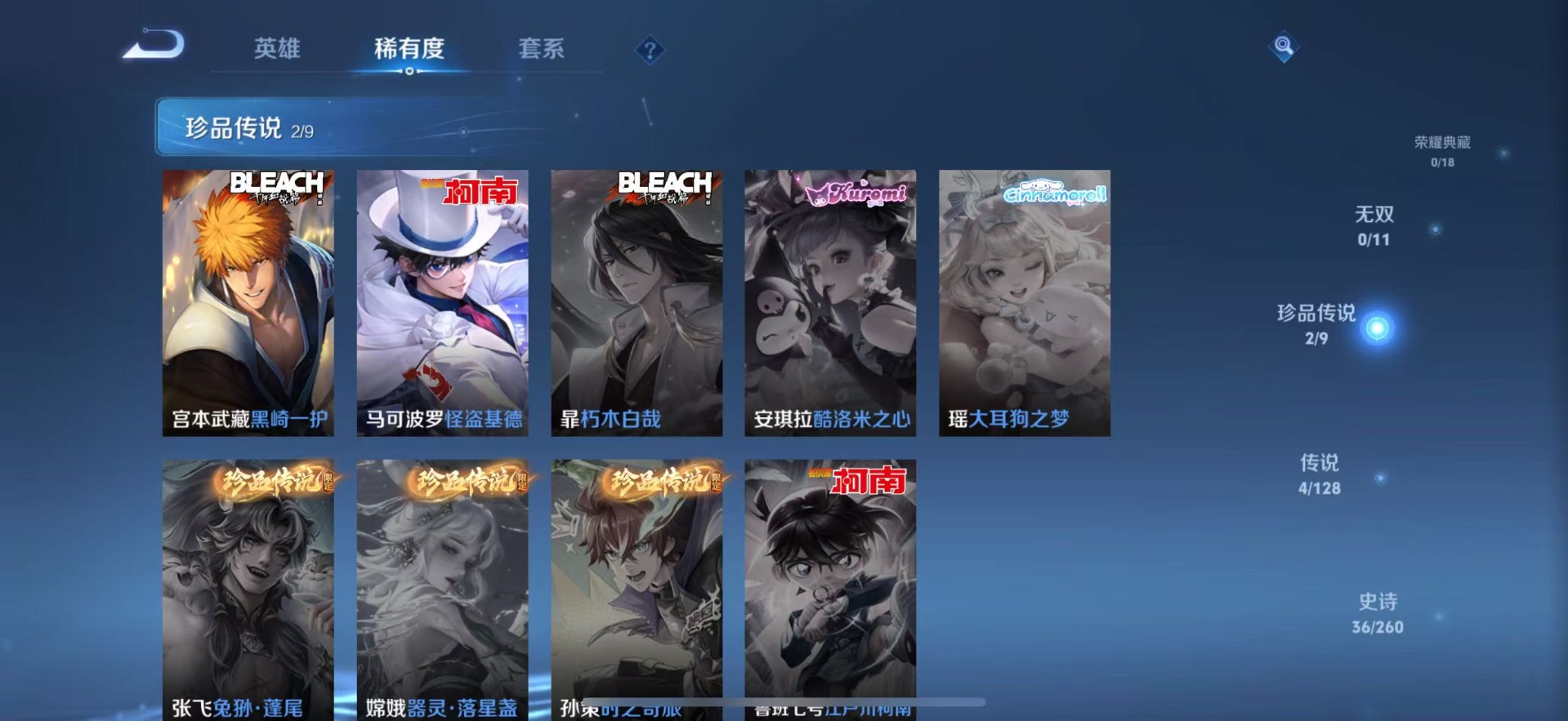 - PX_2085906-贵族等级: V7 英雄数: 121 皮肤数: 172 传说皮: 黄金狮子座,黄金射手座,一念神魔,零号·赤焰,幻光神枪 限定皮: 李小龙,御风骁将,烈魂,天狼溯光者,神威,蜜橘之夏,天狼绘梦者,至尊宝,如梦令-后羿,五谷丰年,鸣野蒿