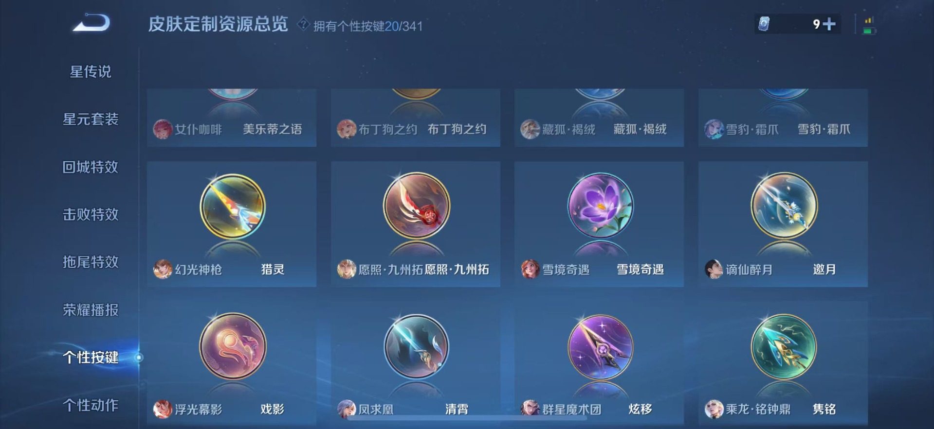 黄忠烈魂,铠青龙志,后羿辉光之辰,诸葛亮时雨天司,公孙离祈雪灵祝,兰陵王默契交锋,裴擒虎李小龙,裴擒虎寅虎·赤拳,上官婉儿梁祝,李白诗剑行,花木兰默契交锋,桑启鸣野蒿,猪八戒猪悟能,孙悟空孙行者,孙悟空大圣娶亲,孙悟空至尊宝,韩信飞衡,韩信逐梦之影,澜愿照·九州拓