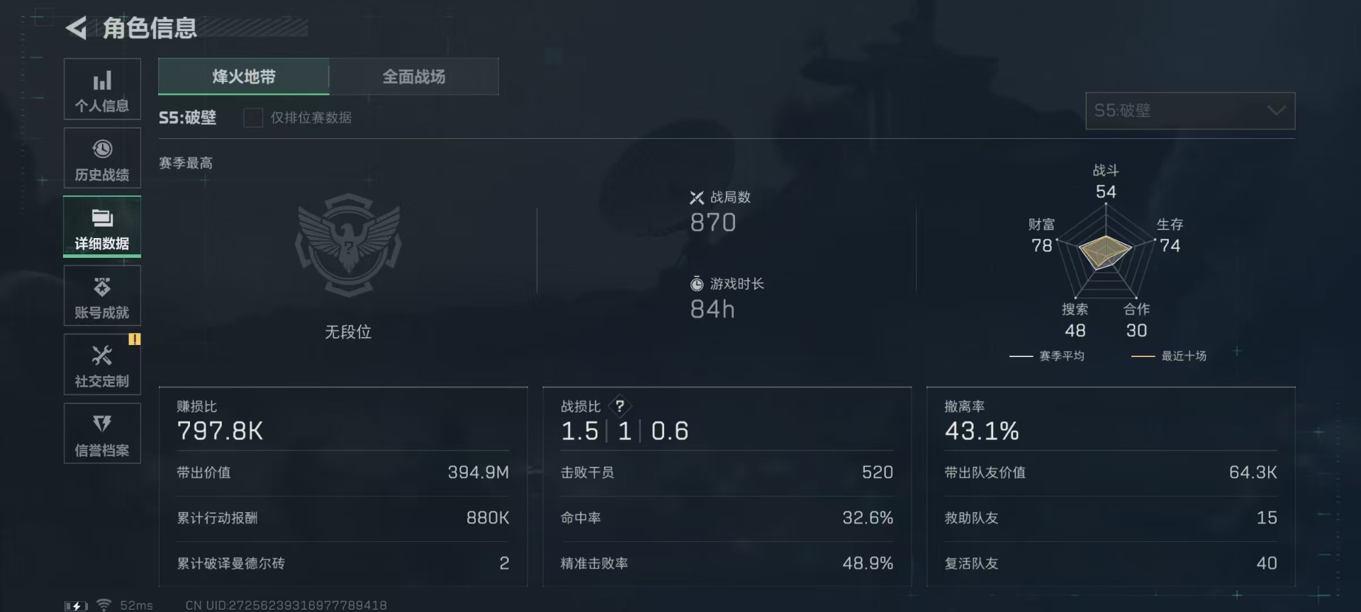 - [11626804]总资产:116.2M 8传说枪械 哈夫币:1.238K 高级安全箱(9.17到期) 可二次 可修改实名 烽火地带段位:无段位 全面战场段位:无段位 传说武器皮肤:SR-25射手步枪-水墨云图,AK-12突击步枪-夜鹰,CAR-15突击步枪-阿米娅,复合弓-黑-天际线,AK-12突击步枪-特斯拉线圈,SR-3M紧凑突击步枪-特斯拉线圈,UZI冲锋枪-特斯拉线圈,725双管霰弹枪-送葬人-无题密令 史诗武器皮肤:SR-3M紧凑突击步枪-英雄,M700狙击步枪-蝮蛇,PKM通用机枪-蝮蛇,AS Val突击步枪-尖端治疗,SR-3M紧凑突击步枪-荒野求生,AKM突击步枪-林中猎手,PKM通用机枪-守夜人,SVD狙击步枪-荒野求生,M1014霰弹枪-林中猎手,SV-98狙击步枪-林中猎手,PSG-1射手步枪-无垢,SV-98狙击步枪-囚徒,SCAR-H战斗步枪-囚徒,腾龙突击步枪-无垢,MP7冲锋枪-无垢,S12K霰弹枪-曙光