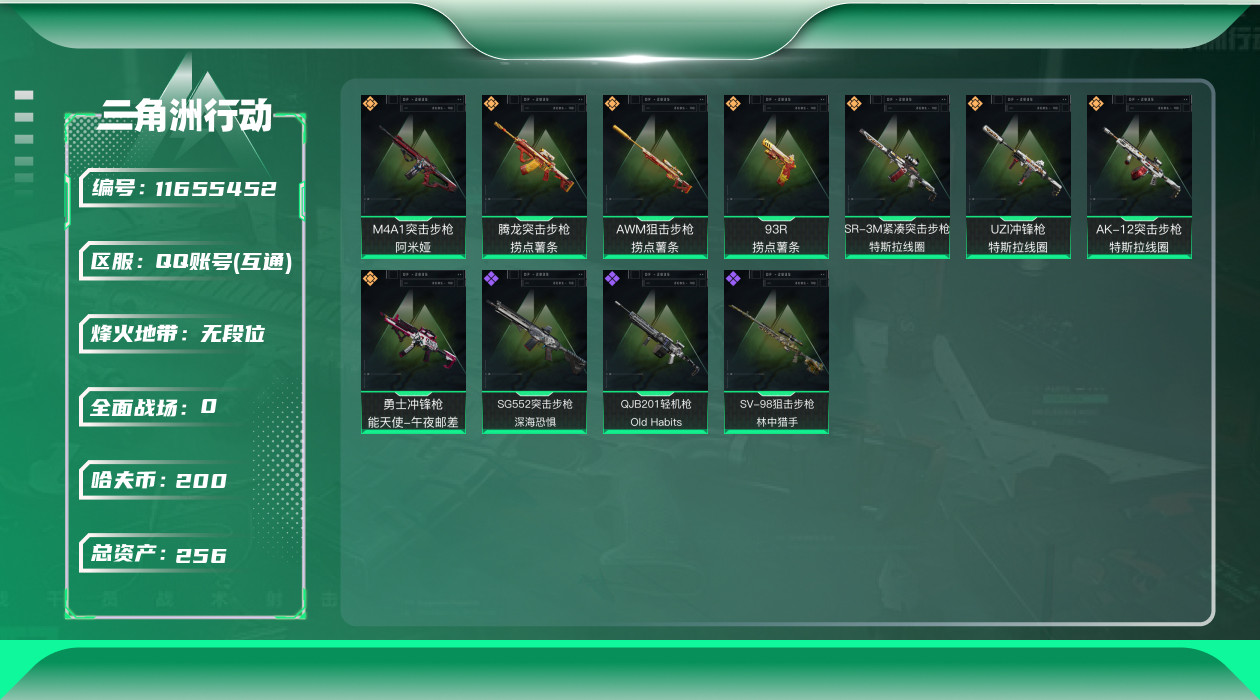 [11655452]总资产:256.9M 8传说枪械 哈夫币:200K 进阶安全箱(2×2)9.15号到期 可二次 可修改实名 烽火地带段位:无段位 全面战场段位:无段位 传说武器皮肤:UZI冲锋枪-特斯拉线圈,AWM狙击步枪-捞点薯条,腾龙突击步枪-捞点薯条,93R-捞点薯条,AK-12突击步枪-特斯拉线圈,SR-3M紧凑突击步枪-特斯拉线圈,勇士冲锋枪-能天使-午夜邮差,M4A1突击步枪-阿米娅 史诗武器皮肤:QJB201轻机枪-Old Habits,SG552突击步枪-深海恐惧,SV-98狙击步枪-林中猎手