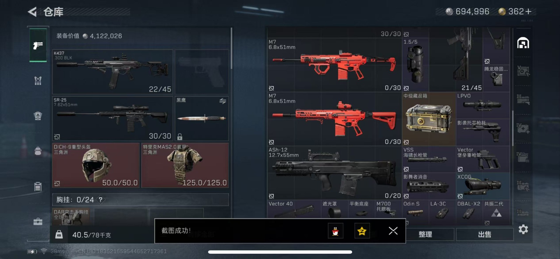 - [11604012]总资产:131.3 4传说枪械 高级安全箱(9.17到期) 可二次 可修改实名 烽火地带段位:钻石 全面战场段位:无段位 哈夫币:70.222 传说武器皮肤:QJB201轻机枪-风林火山,复合弓-黑-天际线,CAR-15突击步枪-阿米娅,725双管霰弹枪-送葬人-无题密令