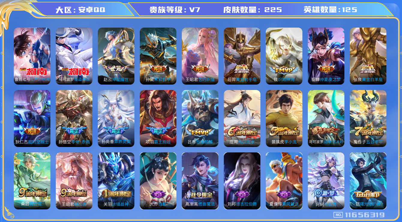 [11656319]V7 2珍品传说 13传说 125英雄 225皮肤 典藏英雄武则天 可修改实名 优质装备:江户川柯南,怪盗基德,黄金射手座,黄金白羊座,炽阳神光,仲夏夜之梦(大飞蛾),零号·赤焰,乞巧织情,淬星耀世,超时空战士-狄仁杰,末日机甲-孙策 珍宝阁皮:万物之道,玩趣恶龙 限定皮:映山客,鸣野蒿,异界灵契(白毛香),高山流水,怒海麟威,五谷丰年,冰锋战神,李小龙,霸王别姬-项羽,山海·玄木吟(马可年限) 史诗皮:鸭鸭历险记-刘禅,化蝶舞,星界战将,龙之律动,茶境仙,破空之剑,紫霞仙子,黄金分割率,特工魅影,江河有灵,百解令(蒙犽),高渐离燃音魔法,蒙恬荣光圣徽,偶像歌手,白蛇,电玩·爆裂旋风,末日机甲-吕布,猫狗日记-孙策,时之恋人-孙尚香,水果甜心,绅士熊喵,天才门将,星夜王子,心灵骇客,功夫厨神,德古拉伯爵,暗隐猎兽者,幽灵船长,鬼剑武藏,心灵战警,乐园奇幻夜,繁星吟游(呼啦呼啦),拒霜思,缤纷独角兽,乘风破浪,逐浪之夏,水晶猎龙者,曙光守护者,箭羽风息,鹰眼统帅,暗夜贵公子,魅力维加斯,未来纪元-赵云