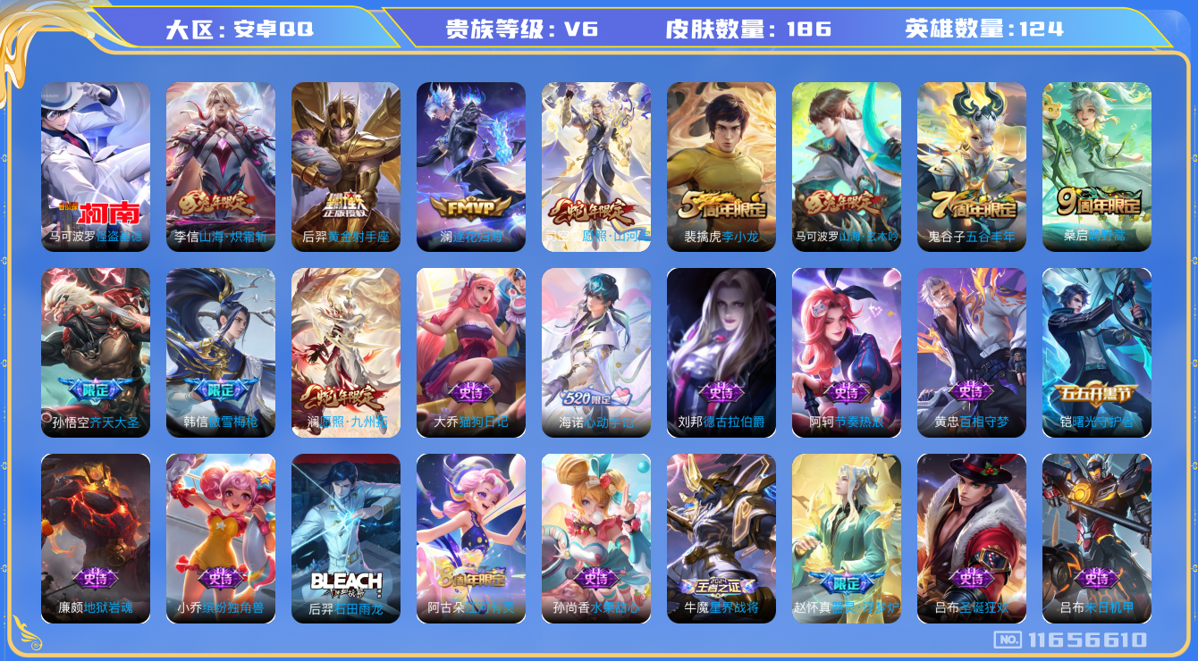 [11656610]V6 1珍品传说 7传说 124英雄 186皮肤 可修改实名 优质装备:怪盗基德,黄金射手座,山海·炽霜斩(李信年限),澜逐花归海,涂山容容 珍宝阁皮:胡桃夹子,蔷薇恋人 限定皮:愿照·九州拓(澜年限),愿照·山河定(司空震年限),鸣野蒿,傲雪梅枪,齐天大圣,五谷丰年,李小龙,山海·玄木吟(马可年限) 史诗皮:器灵·浮梦炉,星界战将,石田雨龙,蒙犽顽岩魄,海诺心动手记,百相守梦-黄忠,黄金分割率,千年之狐,江河有灵,百解令(蒙犽),晚萤,电玩·爆裂旋风,末日机甲-吕布,猫狗日记-大乔,节奏热浪,修罗,摇滚巨星,水果甜心,绅士熊喵,星夜王子,心灵骇客,功夫厨神,德古拉伯爵,暗隐猎兽者,鬼剑武藏,暗渊魔法,地狱岩魂,纤云弄巧,缤纷独角兽,水晶猎龙者,曙光守护者,金属风暴,原初追逐者,圣诞狂欢,圣诞恋歌,鹰眼统帅,魅力维加斯,无心,未来纪元-赵云