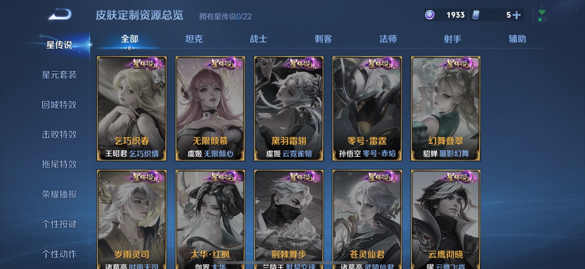 大乔猫狗日记,刘邦德古拉伯爵,哪吒雪上飞焰,廉颇地狱岩魂,小乔缤纷独角兽,赵怀真器灵·浮梦炉,吕布圣诞狂欢,露娜紫霞仙子,吕布末日机甲,刘禅绅士熊喵,宫本武藏鬼剑武藏,貂蝉圣诞恋歌,花木兰水晶猎龙者,安琪拉心灵骇客,白起星夜王子,亚瑟心灵战警,嬴政摇滚巨星,百里玄策原初追逐者,墨子金属风暴,王昭君偶像歌手