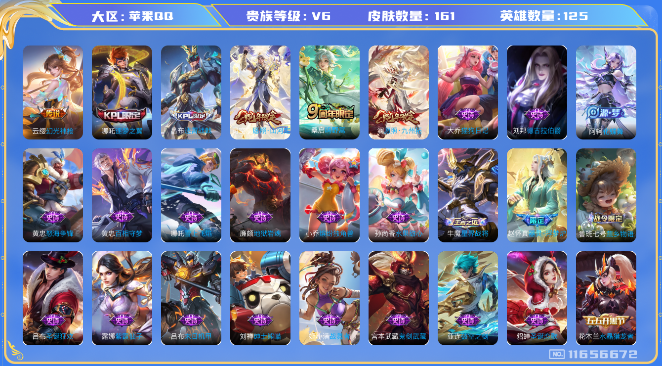 [11656672]V6 4传说 125英雄 161皮肤 可修改实名 传说皮:幻光神枪 珍宝阁皮:妄想食味 限定皮:愿照·九州拓(澜年限),愿照·山河定(司空震年限),逐霄战戟,鸣野蒿,逐梦之翼 史诗皮:器灵·浮梦炉,化蝶舞,星界战将,怒海争锋,破空之剑,战舞者,蒙犽顽岩魄,芈月浮光幕影,蔬乡物语(鲁班七号),百相守梦-百里守约,百相守梦-黄忠,紫霞仙子,蒙恬荣光圣徽,偶像歌手,末日机甲-吕布,猫狗日记-大乔,摇滚巨星,水果甜心,绅士熊喵,星夜王子,心灵骇客,德古拉伯爵,鬼剑武藏,心灵战警,地狱岩魂,缤纷独角兽,水晶猎龙者,金属风暴,原初追逐者,圣诞狂欢,圣诞恋歌,鹰眼统帅,魅力维加斯,雪上飞焰,未来纪元-赵云