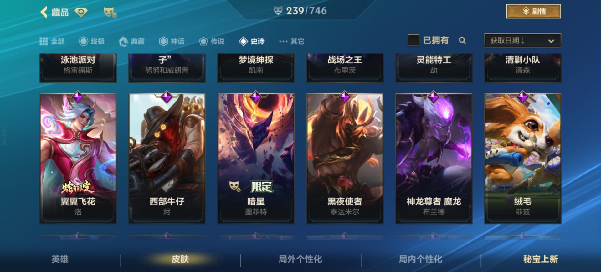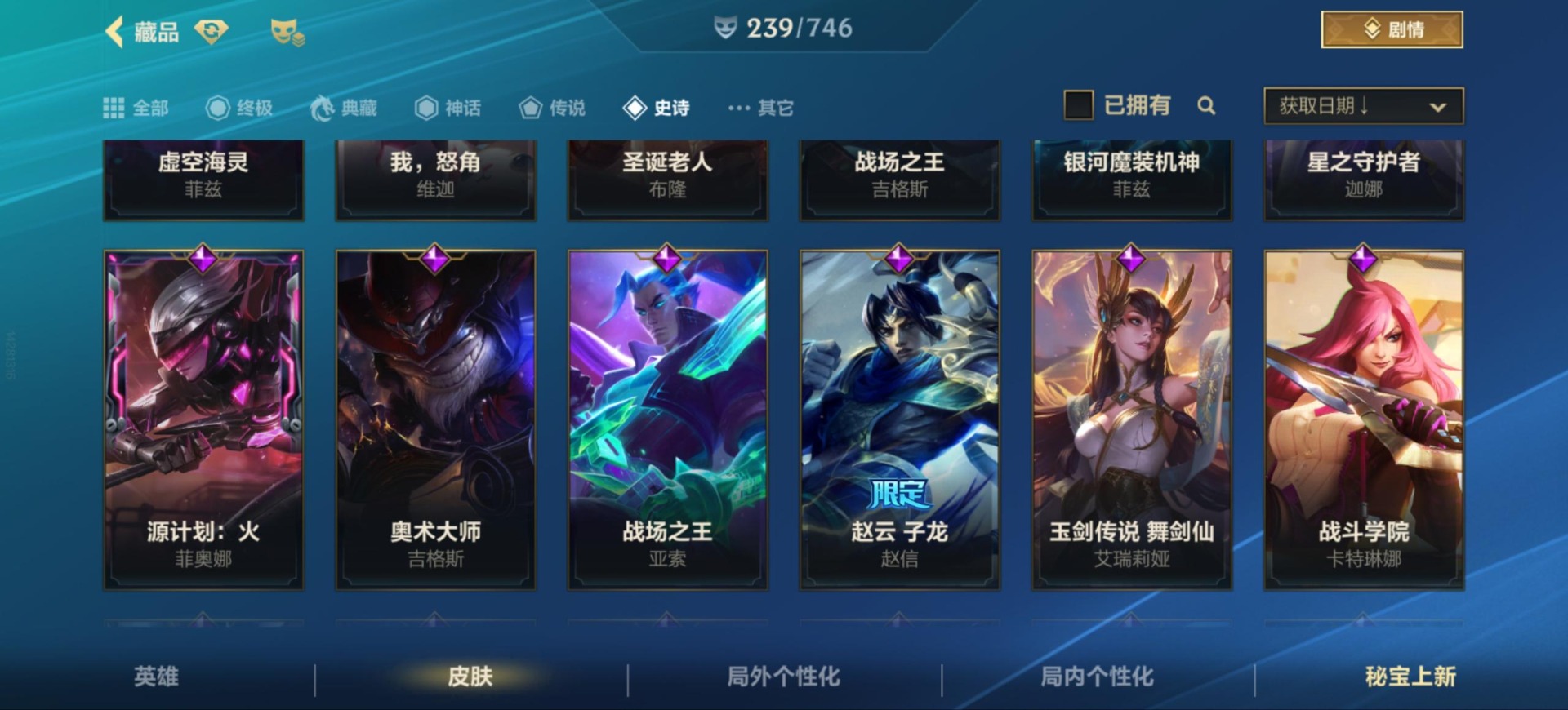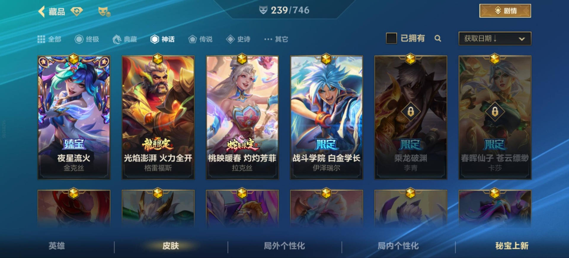 - [11679186]实名: 可修改 贵族等级: V10 英雄数: 125 皮肤数: 466 荣耀水晶: 鸣剑·曳影,全息碎影,九霄神辉 无双皮: 碎月剑心,韩信群星魔术团 珍品传说: 兔狲·蓬尾,酷洛米之心,大耳狗之梦,朽木白哉,黑崎一护 传说皮: 黄金狮子座,黄金射手座,绛天战甲,末日机甲-孙尚香,地狱火,仲夏夜之梦,零号·赤焰,时之恋人-刘备,淬星耀世,遇见胡旋,末日机甲-孙策,挚爱之约,挚爱花嫁,无双飞将,碎云,画中仙,妄想实况,艾琳觅芳踪,乘龙·问璇玑,落雪白狼,幻光神枪,祥瑞亨通,星之鸣奏,续相思,诡秘之主 限定皮: 冰锋战神,遇见飞天,李小龙,祈雪灵祝,游园惊梦,梁祝,时雨天司,引擎之心,魔法小厨娘,辉光之辰,异界灵契,天魔缭乱,神威,飞衡,天狼狩猎者,冰霜恋舞曲,逐梦之影,逐梦之光,神奇女侠,美猴王,白虎志,梅西,至尊宝,一生所爱,武陵仙君,如梦令-后羿,大圣娶亲,默契交锋-花木兰,霸王别姬-虞姬,高山流水,孙行者,猪悟能,寅虎·展翼,补天,百木心枪,玉兔公主,启示之音,匿光决锋者,无尽星芒,五谷丰年,神器·万象笔,山海·碧波行,齐天大圣,至美·化雀舞,至美·乘鲤谣,鸣野蒿,陌上桑,愿照·千秋盛,愿照·众生和,愿照·山河定,愿照·岁时盈,愿照·福禄聚,愿照·九州拓