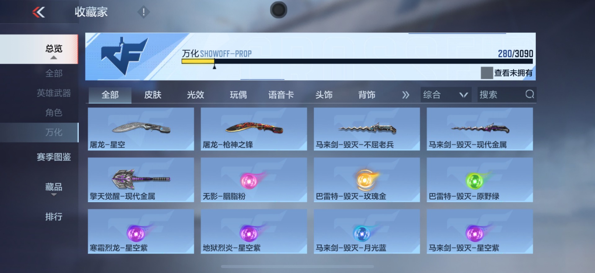 - [12262716]10橙皮 7紫皮 47皮肤 25英雄 91卡面 690已用源晶 铂金 优质装备:紫阙金琅套装,幻影-奇点,狂徒-紫阙金琅,狂徒-洪荒怒焰,冥驹-全息波普//2.0,标配-紫阙金琅,军刀-合金战车,金琅斧,蝴蝶刀-侦察力量,飞将-天界神兵,鬼魅-盖世英雄,圣石匕首,威龙之刃,雄鹿-起源,骇灵-紫阙金琅,戍卫-紫阙金琅 亮点皮肤:幻影-2022全球冠军赛,2022全球冠军赛 蝴蝶刀 套装:2022全球冠军赛