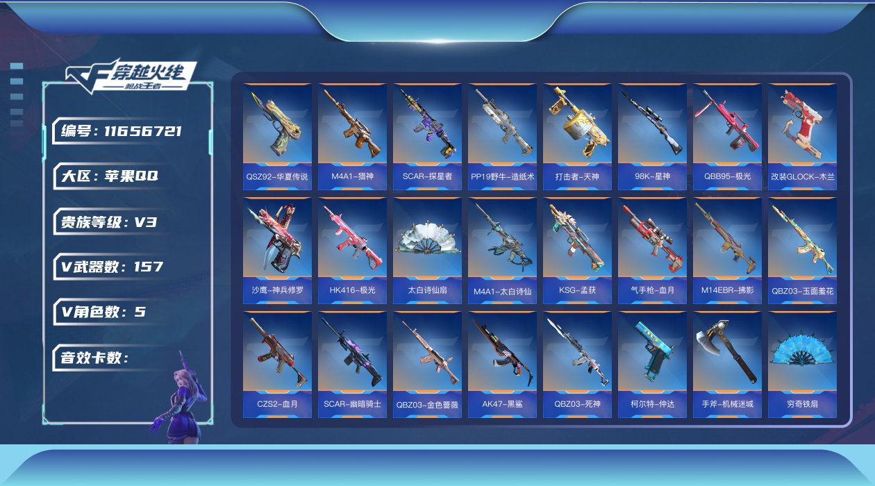 [11656721]可二次 可修改实名 V3 11王者武器 157英雄武器 5英雄角色 280万化 枪圣SS 武器:王者之影,王者之心,M4A1-仲达,M200-幻神,CZ75-策,激昂霸王枪,KSG-孟获,81式-光明之神,MK47-云舞,加特林-炼狱,王者之魂,AK47-无影,AK47-火麒麟,AK47-燎天净火,M4A1-死神,M4A1-雷神,M4A1-黑骑士,巴雷特-极光,巴雷特-毁灭,QBZ03-金色蔷薇,QBZ03-死神,QBB95-极光,双持斯泰尔-天使,AK47-雷麒麟,AK47-沙漠领主,AK47-黑鲨,AK47-血武士,M4A1-龙血,M4A1-猎神,M4A1-玫瑰精灵,M4A1-赛博雷神,M4A1-夏清觉醒,M4A1-千变,M4A1-海骑士,AK12-天启,SCAR-幽暗骑士,SCAR-探星者,9A91-天神,98K-星神,AWM-天龙,09式狙-天神,AWM-裁决,98K-血月,AK47-破空冰刃,M14EBR-拂影,汤姆逊-烈龙,刘易斯-血月,PP19野牛-造纸术,CBJ-MS-毒蜂,地狱火,CZS2-血月,打击者-天神,AA12-火药,地狱烈炎,QBZ03-玉面羞花,MK47-鼓龙,柯尔特-仲达,AN94-赳赳秦师,HK416-极光,M4A1-太白诗仙,白骨利刃,穷奇铁扇,M16-恶魔,沙鹰-修罗,沙鹰-神兵修罗,气手枪-血月,USP-机械迷城,QSZ92-天使,沙鹰-宇航兔兔,QSZ92-华夏传说,改装GLOCK-木兰,百战巾帼枪,马来剑-毁灭,手斧-机械迷城,尼泊尔-冰锋觉醒,M4A1-铁胆虎魄,QBB95-再战涿鹿,王者之翼闪光弹,王者之翼烟雾弹,王者之心烟雾弹,王者之心闪光弹,神罚战斧,丛林匕首-庆龙觉醒,龙啸,唐刀-大唐荣耀,唐刀-华夏传说,血月,屠龙,龙鳞-觉醒,太白诗仙扇,海斯博士双刃-激光,蝴蝶刀-天神,女皇利刃-铁胆虎魄,高爆手雷-雷霆,黑骑士烟雾弹,机械纪元手雷,燃烧弹-游骑兵,烟雾弹-游骑兵,闪光弹-游骑兵,死神手雷,雷神手雷,雷神烟雾弹,雷神闪光弹,高爆手雷-无限,炽芒蝶刀,王者之竞手雷,手雷-鼓龙,卡牌大师-悠悠,分裂雷-偃蛇,思召剑,破邪蛇棍觉醒,甩棍-卧龙觉醒,马来剑-耀金伯爵,气勇胆烈戟,龙爪手-鼓龙,M14EBR-葫芦山庄,AN94-盖,SCAR-心动PICK,王者之竞烟雾弹,DDM4-PDW-星际宇航觉醒