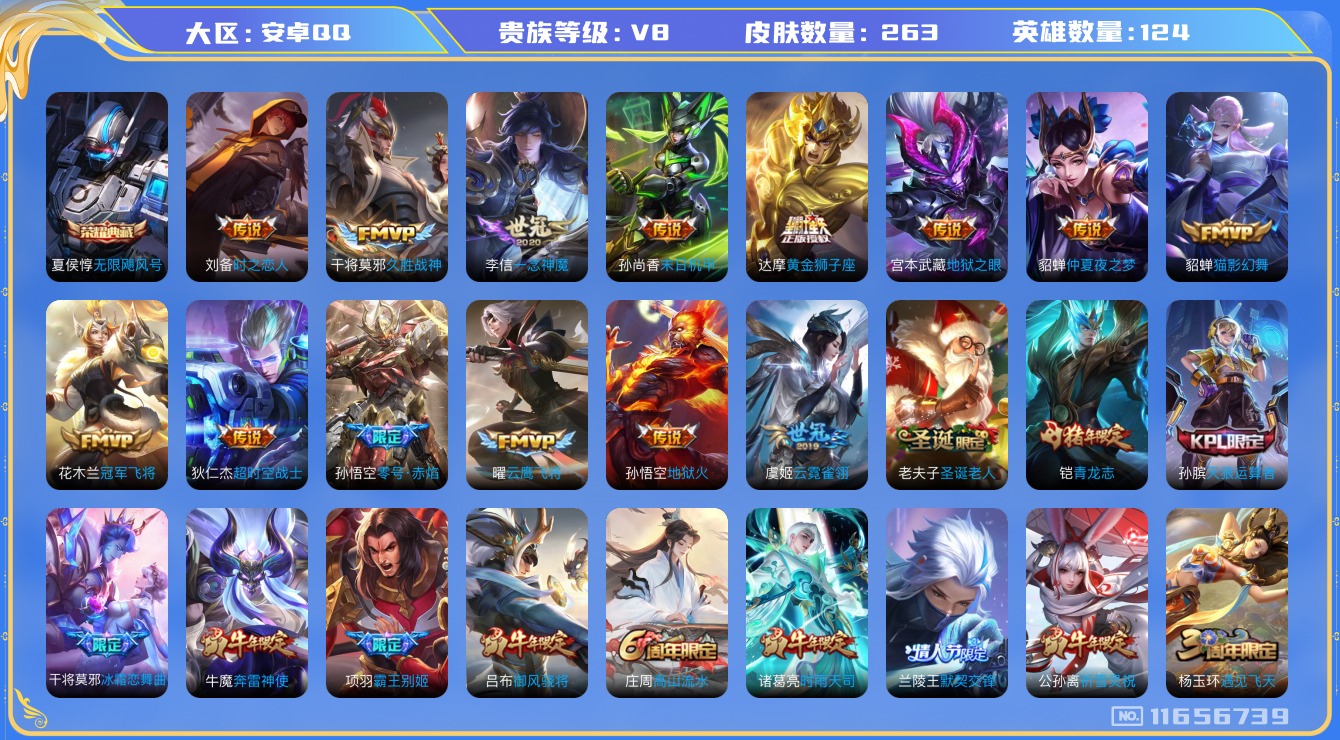 - PX_2095938-实名: 可修改 贵族等级: V8 英雄数: 123 皮肤数: 251 荣耀水晶: 无限飓风号 星传说: 幽冥火,幻舞叠翠 传说皮: 冠军飞将,猫影幻舞,久胜战神,地狱火,乞巧织情,游龙清影,淬星耀世,超时空战士-狄仁杰,山海·炽霜斩,山海·琳琅生,山海·苍雷引,炽翼辉光 限定皮: 遇见飞天,李小龙,祈雪灵祝,游园惊梦,梁祝,逐梦之光,凤求凰,寅虎·御盾,凤凰于飞,至尊宝,大圣