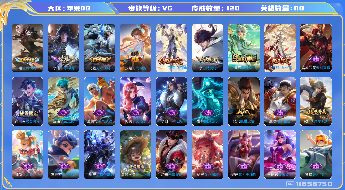 [11656750]V6 8传说 118英雄 120皮肤 可修改实名 优质装备:云鹰飞将(小将军),一念神魔,无双飞将 传说皮:幻光神枪 珍宝阁皮:女武神 限定皮:愿照·九州拓(澜年限),愿照·山河定(司空震年限),鸣野蒿,诗剑行 史诗皮:破空之剑,蔬乡物语(鲁班七号),特工魅影,千年之狐,高渐离燃音魔法,偶像歌手,乱世虎臣,节奏热浪,女仆咖啡,摇滚巨星,水果甜心,绅士熊喵,天才门将,幽灵船长,鬼剑武藏,乘风破浪,逐浪之夏,圣诞狂欢,鹰眼统帅,魅力维加斯