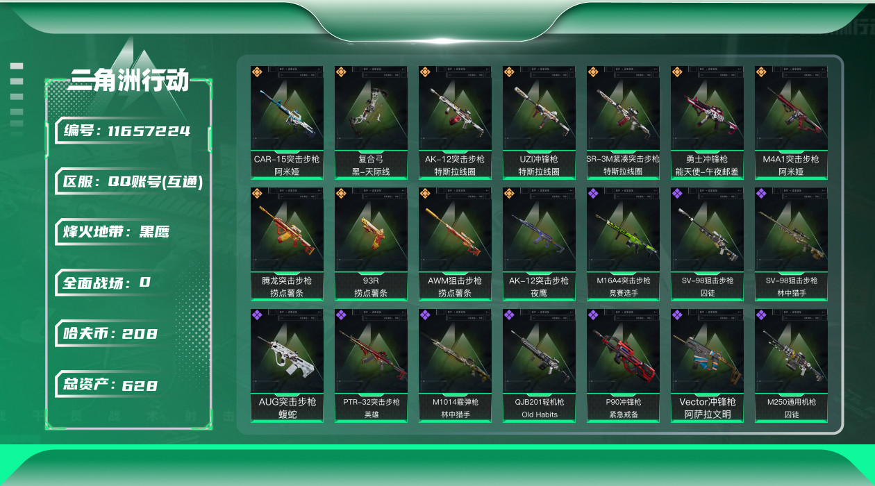 [11657224]总资产:628.7M 11传说枪械 哈夫币:208K 顶级安全箱(3×3)9.15号到期 可二次 可修改实名 优质装备:顶级安全箱(3x3) 烽火地带段位:黑鹰 全面战场段位:上等兵 传说武器皮肤:UZI冲锋枪-特斯拉线圈,AWM狙击步枪-捞点薯条,腾龙突击步枪-捞点薯条,93R-捞点薯条,AK-12突击步枪-特斯拉线圈,SR-3M紧凑突击步枪-特斯拉线圈,勇士冲锋枪-能天使-午夜邮差,复合弓-黑-天际线,M4A1突击步枪-阿米娅,CAR-15突击步枪-阿米娅,AK-12突击步枪-夜鹰 史诗武器皮肤:AUG突击步枪-蝮蛇,SG552突击步枪-尖端治疗,QJB201轻机枪-Old Habits,M1014霰弹枪-林中猎手,PKM通用机枪-守夜人,AS Val突击步枪-尖端治疗,M700狙击步枪-守夜人,Ash-12战斗步枪-守夜人,SR-25射手步枪-尖端治疗,勇士冲锋枪-深海恐惧,AKM突击步枪-林中猎手,M16A4突击步枪-竞赛选手,M250通用机枪-囚徒,SV-98狙击步枪-林中猎手,PTR-32突击步枪-英雄,SV-98狙击步枪-囚徒,Vector冲锋枪-阿萨拉文明,M700狙击步枪-竞技风,P90冲锋枪-紧急戒备