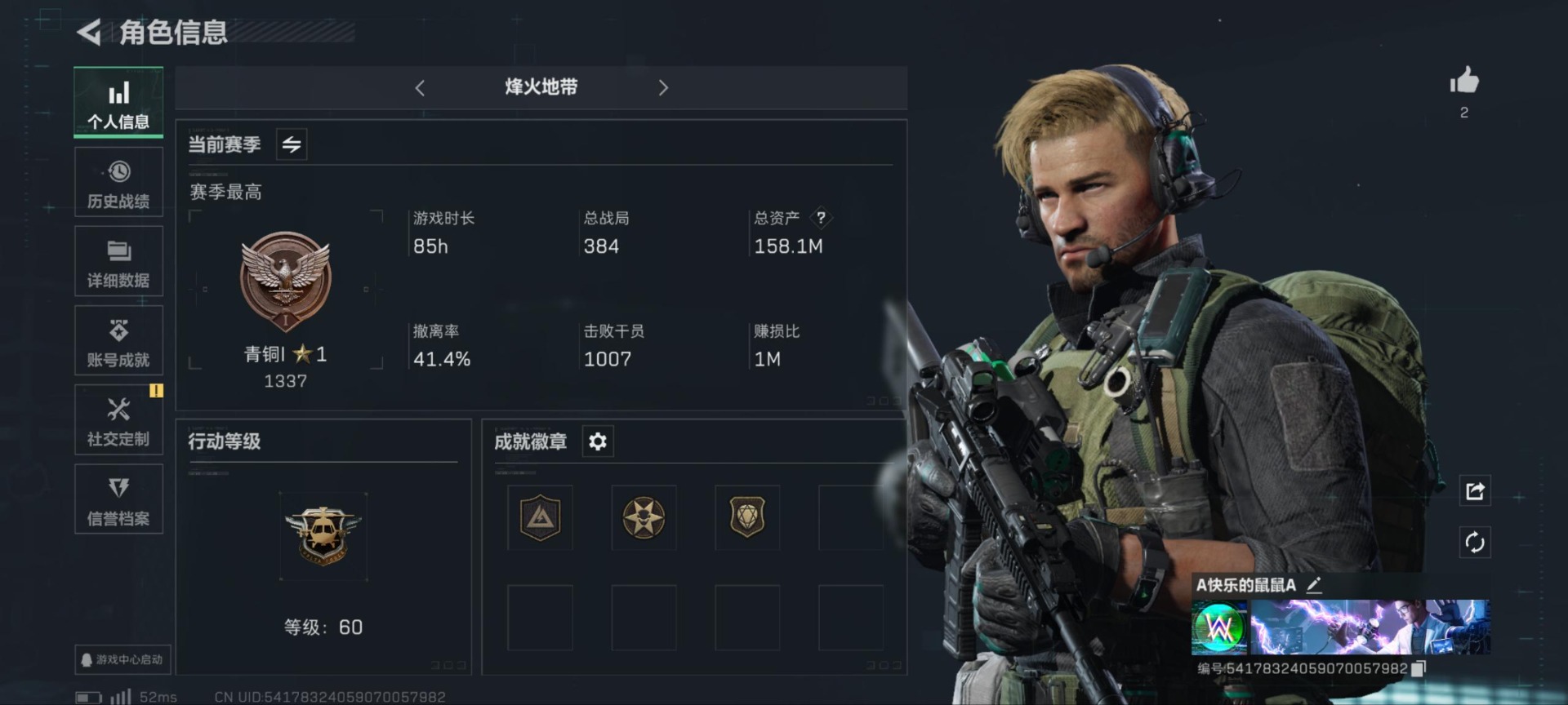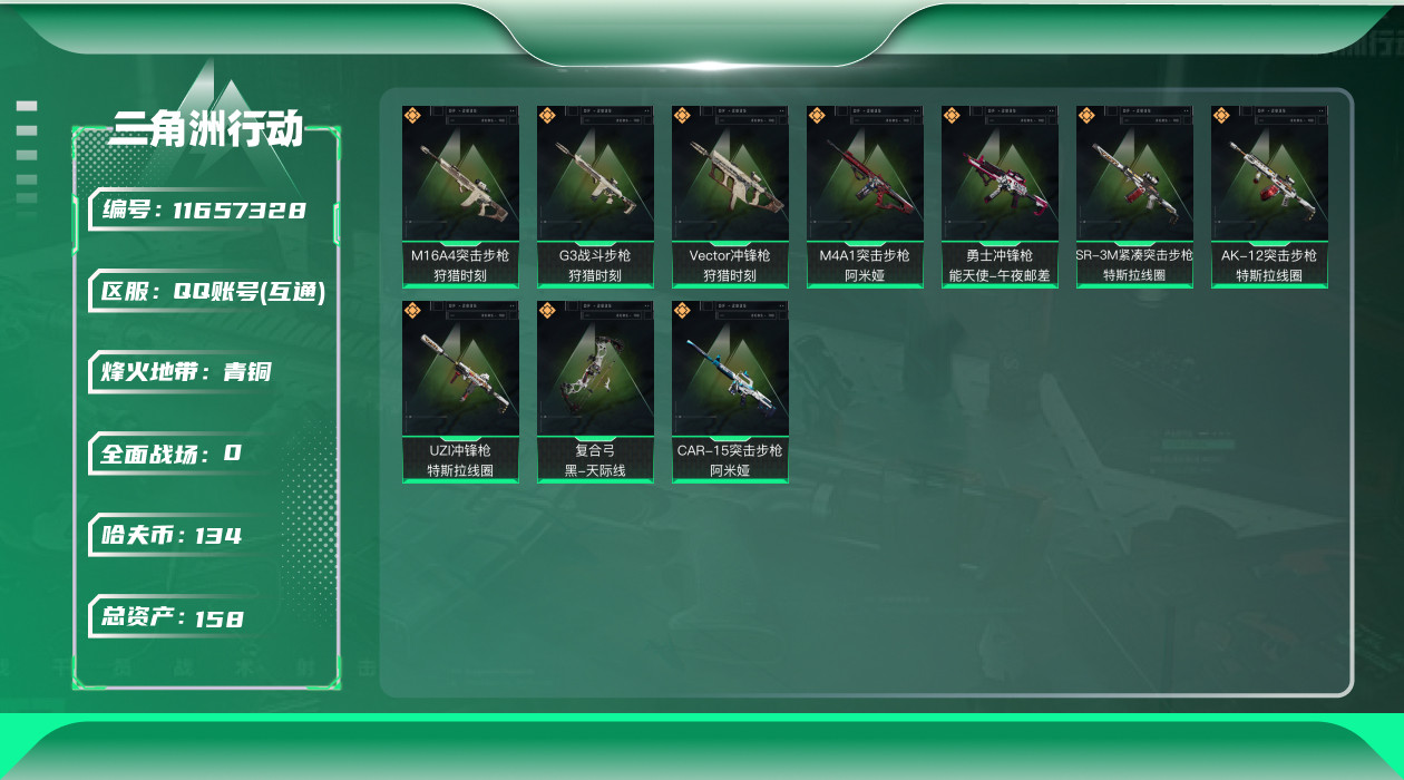 [11657328]总资产:158.1M 10传说枪械 哈夫币:134K 进阶安全箱(9.17到期) 可二次 可修改实名 烽火地带段位:青铜 全面战场段位:无段位 传说武器皮肤:UZI冲锋枪-特斯拉线圈,M16A4突击步枪-狩猎时刻,AK-12突击步枪-特斯拉线圈,SR-3M紧凑突击步枪-特斯拉线圈,勇士冲锋枪-能天使-午夜邮差,Vector冲锋枪-狩猎时刻,G3战斗步枪-狩猎时刻,复合弓-黑-天际线,M4A1突击步枪-阿米娅,CAR-15突击步枪-阿米娅