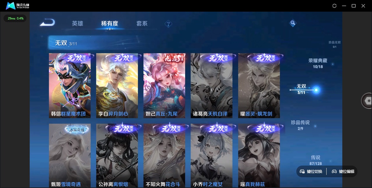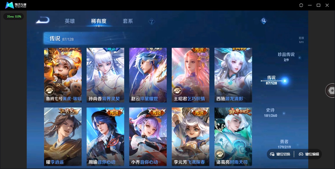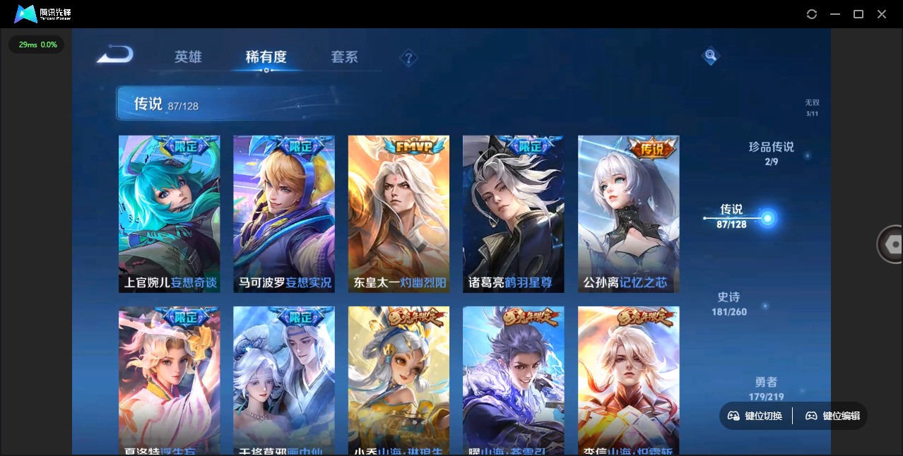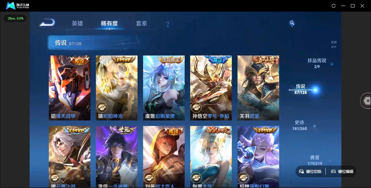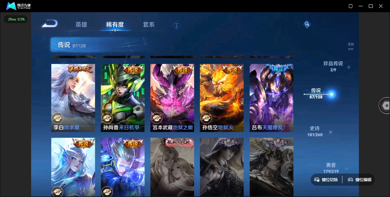 - [11579330]V7 1典藏 8传说 124英雄 229皮肤 可修改实名 荣耀水晶:鸣剑·曳影 传说皮:云诺千山,幻光神枪,黄金白羊座,零号·赤焰,久胜战神 珍宝阁皮:妄想食味,玩趣恶龙 限定皮:愿照·山河定(司空震年限),逐霄战戟,鸣野蒿,时雨天司(水龙头),遇见飞天,五谷丰年 史诗皮:星界战将,茶境仙,器灵·浮梦炉,鸭鸭历险记-刘禅,龙之律动,百相守梦-百里守约,百相守梦-黄忠,蒙犽顽岩魄,蔬乡物语(鲁班七号),化蝶舞,破空之剑,紫霞仙子,特工魅影,千年之狐,江河有灵,高渐离燃音魔法,百解令(蒙犽),蒙恬荣光圣徽,冰冠公主,白蛇,暗夜猫娘,末日机甲-吕布,猫狗日记-大乔,节奏热浪,修罗,女仆咖啡,水果甜心,天才门将,星夜王子,心灵骇客,功夫厨神,德古拉伯爵,暗隐猎兽者,幽灵船长,鬼剑武藏,心灵战警,乐园奇幻夜,舞动绿茵,地狱岩魂,纤云弄巧,拒霜思,缤纷独角兽,逐浪之夏,水晶猎龙者,曙光守护者,金属风暴,原初追逐者,圣诞狂欢,鹰眼统帅,暗夜贵公子,黎明之约,未来纪元-赵云