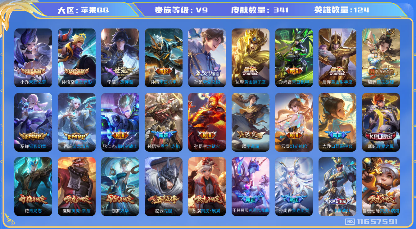 [11657591]V9 2典藏 28传说 124英雄 341皮肤 可修改实名 优质装备:天鹅之梦(小乔典藏),全息碎影(猴子典藏),黄金狮子座,黄金射手座,猫影幻舞,一念神魔,末日机甲-孙尚香(绿蚂蚱),地狱火,零号·赤焰,李逍遥,游龙清影(小青龙),超时空战士-狄仁杰,遇见胡旋,末日机甲-孙策,挚爱之约 传说皮:幻光神枪 珍宝阁皮:优雅恋人,女武神 限定皮:愿照·众生和(妲己年限),逐霄战戟,至尊宝,白虎志(电光耗子),凤求凰(白切鸡),太华(伽罗年限),梅西,武陵仙君(小桃花),异界灵契(白毛香),寅虎·展翼(孙膑年限),白鹤梁神女,时雨天司(水龙头),神威(电光马子),飞衡(韩信年限),遇见飞天,高山流水,五谷丰年,青龙志(铠年限),冰锋战神,武圣,梁祝,天狼狩猎者,龙胆,逐梦之翼,逐梦之星,天狼绘梦者,李小龙,逐梦之影,逐梦之光,朱雀志(守约年限),永曜之星,辉光之辰,如梦令-嫦娥,如梦令-后羿,真爱至上,孙行者,猪悟能,一生所爱,大圣娶亲,引擎之心,天魔缭乱,青春决赛季,冰霜恋舞曲,匿光追影者,寅虎·御盾(廉颇年限),寅虎·瑞焰(虎皮蛋子),寅虎·心曲(虎婆),寅虎·赤拳(老虎年限),无尽星芒 史诗皮:器灵·浮梦炉,谪仙醉月,龙之律动,百相守梦-周瑜,茶境仙,撼地雄心,破空之剑,战舞者,涂山红红,东方月初,紫霞仙子,电玩小子(小书包),黄金分割率,特工魅影,千年之狐,蒙恬荣光圣徽,无限星赏官,冰冠公主,青蛇,偶像歌手,电玩·爆裂旋风,暗夜猫娘,龙骑士(小龙虾),末日机甲-吕布,猫狗日记-孙策,猫狗日记-大乔,乱世虎臣,节奏热浪,女仆咖啡,摇滚巨星,水果甜心,绅士熊喵,天才门将,星夜王子,心灵骇客,时之奇旅-安琪拉,德古拉伯爵,暗隐猎兽者,幽灵船长,鬼剑武藏,心灵战警,乐园奇幻夜,舞动绿茵,地狱岩魂,纤云弄巧,繁星吟游(呼啦呼啦),拒霜思,缤纷独角兽,乘风破浪,逐浪之夏,水晶猎龙者,曙光守护者,箭羽风息,金属风暴,原初追逐者,圣诞狂欢,圣诞恋歌,鹰眼统帅,暗夜贵公子,魅力维加斯,黎明之约,寅虎·御盾,千筹问战,无心,未来纪元-赵云