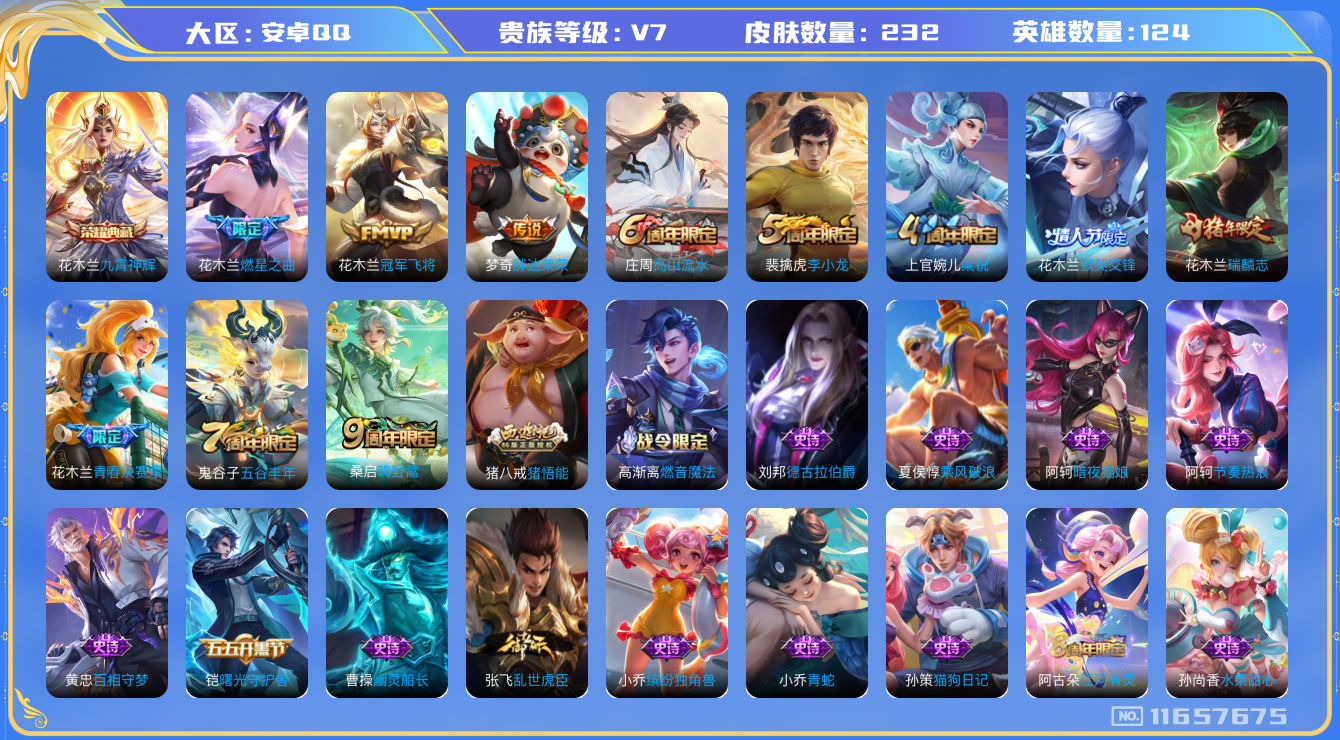 [11657675]V7 1典藏 4传说 124英雄 232皮肤 可修改实名 优质装备:九霄神辉(木兰典藏),冠军飞将,胖达荣荣,燃星之曲,涂山容容 珍宝阁皮:妄想食味,优雅恋人,蔷薇恋人 限定皮:鸣野蒿,瑞麟志(木兰年限),高山流水,五谷丰年,梁祝,李小龙,默契交锋-花木兰,猪悟能,青春决赛季 史诗皮:星界战将,破空之剑,蔬乡物语(鲁班七号),百相守梦-黄忠,紫霞仙子,苍穹之光,特工魅影,千年之狐,江河有灵,魅语,百解令(蒙犽),高渐离燃音魔法,蒙恬荣光圣徽,冰冠公主,青蛇,偶像歌手,暗夜猫娘,末日机甲-吕布,猫狗日记-孙策,乱世虎臣,节奏热浪,修罗,女仆咖啡,摇滚巨星,水果甜心,德古拉伯爵,幽灵船长,鬼剑武藏,纤云弄巧,繁星吟游(呼啦呼啦),拒霜思,缤纷独角兽,乘风破浪,逐浪之夏,水晶猎龙者,曙光守护者,金属风暴,原初追逐者,圣诞狂欢,圣诞恋歌,鹰眼统帅,魅力维加斯,黎明之约,无心,未来纪元-赵云