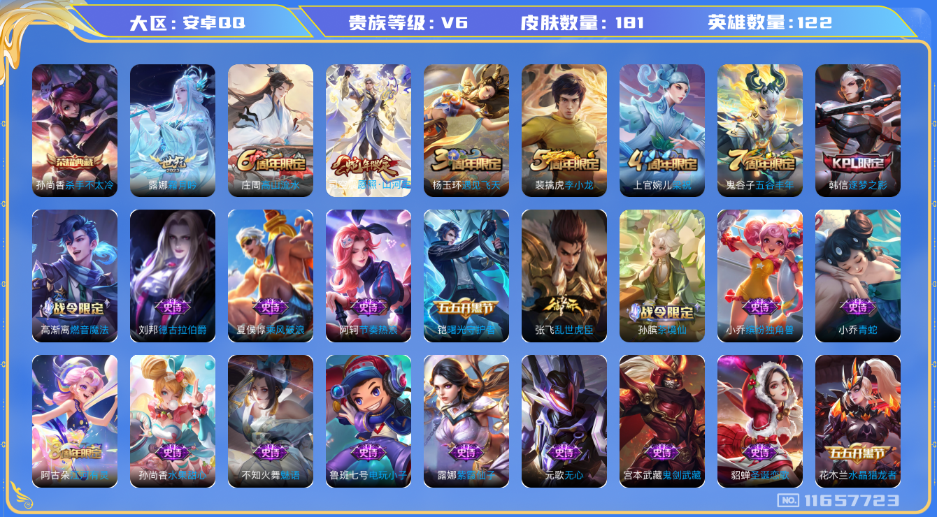 [11657723]V6 1典藏 2传说 122英雄 181皮肤 可修改实名 优质装备:杀手不太冷,霜月吟 珍宝阁皮:妄想食味,女武神 限定皮:愿照·山河定(司空震年限),遇见飞天,高山流水,五谷丰年,梁祝,李小龙,逐梦之影 史诗皮:龙之律动,茶境仙,紫霞仙子,电玩小子(小书包),白龙吟,特工魅影,千年之狐,江河有灵,魅语,百解令(蒙犽),高渐离燃音魔法,青蛇,偶像歌手,乱世虎臣,节奏热浪,修罗,水果甜心,德古拉伯爵,鬼剑武藏,舞动绿茵,纤云弄巧,缤纷独角兽,乘风破浪,逐浪之夏,水晶猎龙者,曙光守护者,金属风暴,原初追逐者,圣诞恋歌,鹰眼统帅,魅力维加斯,黎明之约,无心