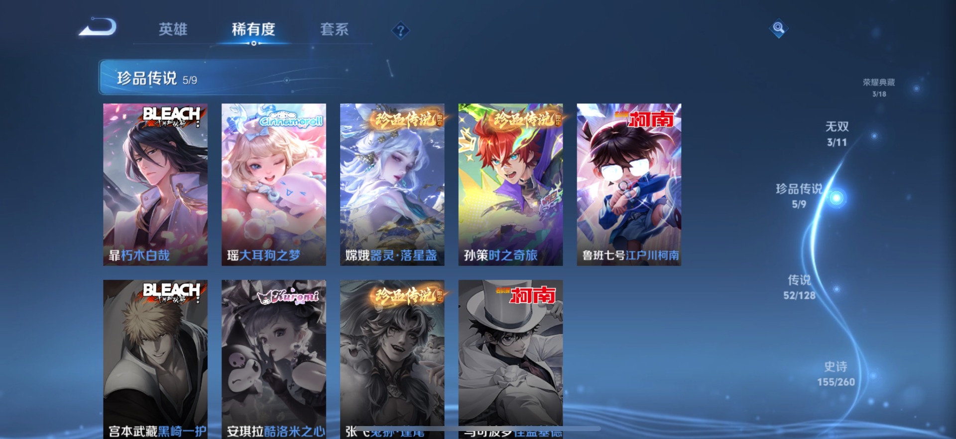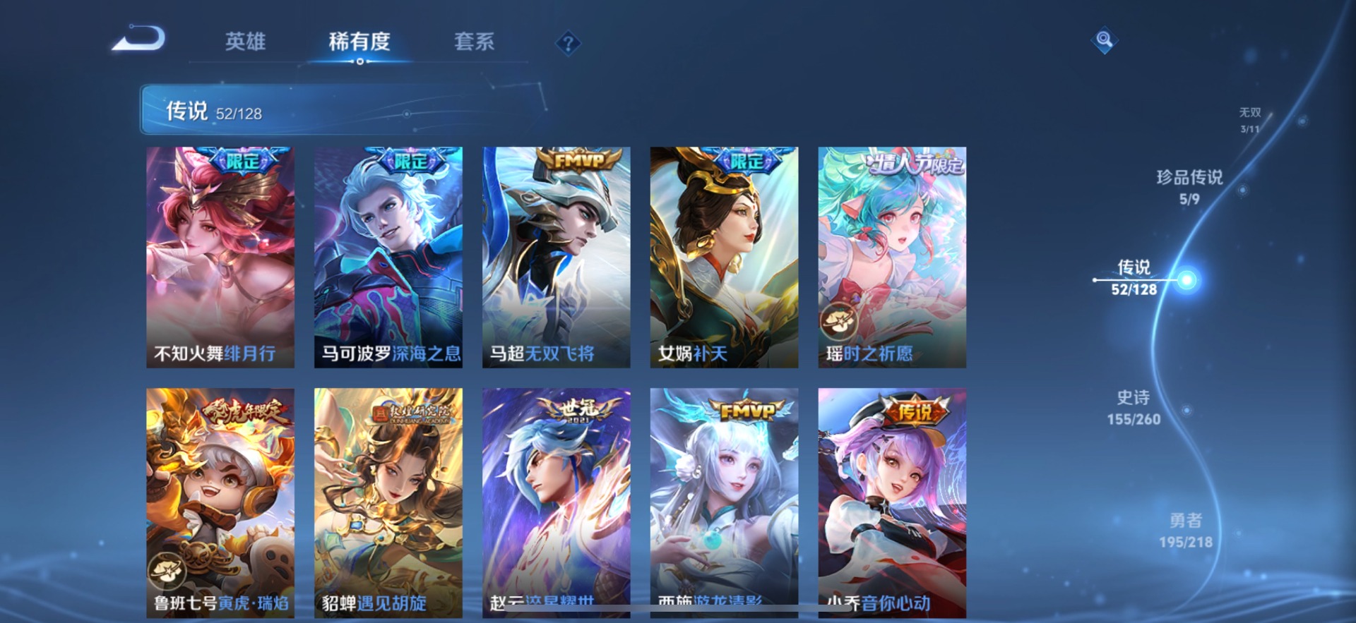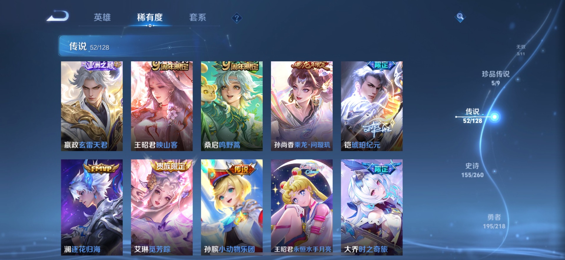 大乔时之奇旅,铠琥珀纪元,孙膑小动物乐团,张飞百相守梦,赵云淬星耀世,小乔音你心动,干将莫邪画中仙,孙尚香乘龙·问璇玑,吕布遇见神鼓,后羿千劫归真,杨玉环星之鸣奏,貂蝉遇见胡旋,裴擒虎祥瑞亨通,夏洛特浮生妄,艾琳觅芳踪,西施游龙清影,西施续相思,嬴政玄雷天君,张良黄金白羊座,曜云鹰飞将,马超无双飞将,澜逐花归海,虞姬云霓雀翎,王昭君永恒水手月亮
