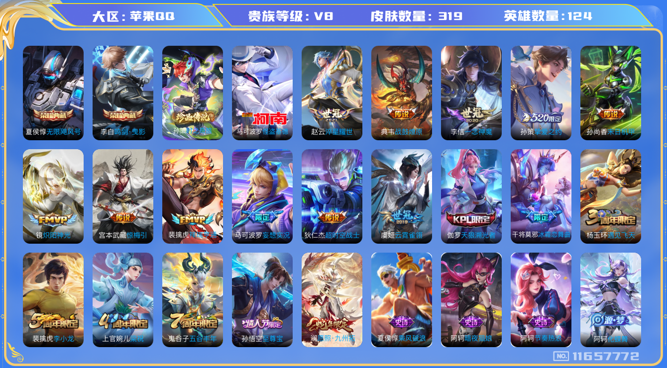 - [11227588]V8 2典藏 8传说 119英雄 215皮肤 可修改实名 荣耀水晶:银白咏叹调(倪克斯侍卫),杀手不太冷 传说皮:黄金狮子座,猫影幻舞,炽阳神光,无双飞将,超时空战士-狄仁杰,山海·苍雷引(电光曜子) 珍宝阁皮:玩趣恶龙 限定皮:鸣野蒿,神威(电光马子),飞衡(韩信年限),五谷丰年,冰锋战神,梁祝,逐梦之影,霸王别姬-虞姬,奇迹圣诞,神奇女侠,山海·玄木吟(马可年限) 史诗皮:紫霞仙子,苍穹之光,电玩小子(小书包),黄金分割率,特工魅影,永昼,蒙恬荣光圣徽,冰冠公主,偶像歌手,晚萤,无限星赏官,龙骑士(小龙虾),末日机甲-吕布,猫狗日记-孙策,乱世虎臣,节奏热浪,修罗,女仆咖啡,水果甜心,天才门将,星夜王子,心灵骇客,功夫厨神,德古拉伯爵,暗隐猎兽者,幽灵船长,鬼剑武藏,地狱岩魂,纤云弄巧,繁星吟游(呼啦呼啦),缤纷独角兽,乘风破浪,逐浪之夏,水晶猎龙者,热力回旋,金属风暴,原初追逐者,圣诞狂欢,鹰眼统帅,王者之锤,魅力维加斯,黎明之约,赏金猎手