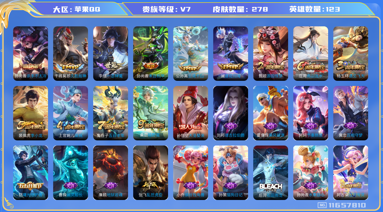 [11657810]V7 1典藏 6传说 123英雄 278皮肤 可修改实名 优质装备:杀手不太冷,久胜战神,一念神魔,末日机甲-孙尚香(绿蚂蚱),澜逐花归海,涂山容容 传说皮:云诺千山 珍宝阁皮:妄想食味,蔷薇恋人 限定皮:鸣野蒿,遇见飞天,高山流水,五谷丰年,游园惊梦,梁祝,李小龙,大圣娶亲 史诗皮:鸭鸭历险记-刘禅,苍鳞隐世,绮世丹青,星界战将,龙之律动,石田雨龙,百相守梦-周瑜,蔬乡物语(鲁班七号),百相守梦-黄忠,紫霞仙子,白龙吟,特工魅影,千年之狐,江河有灵,匿光侦查者,百解令(蒙犽),冰冠公主,末日机甲-吕布,猫狗日记-孙策,乱世虎臣,节奏热浪,摇滚巨星,水果甜心,天才门将,星夜王子,心灵骇客,功夫厨神,德古拉伯爵,暗隐猎兽者,幽灵船长,鬼剑武藏,暗渊魔法,心灵战警,天秀·启明,舞动绿茵,地狱岩魂,纤云弄巧,繁星吟游(呼啦呼啦),拒霜思,缤纷独角兽,乘风破浪,逐浪之夏,水晶猎龙者,曙光守护者,金属风暴,原初追逐者,圣诞狂欢,圣诞恋歌,鹰眼统帅,魅力维加斯,黎明之约,无心,未来纪元-赵云