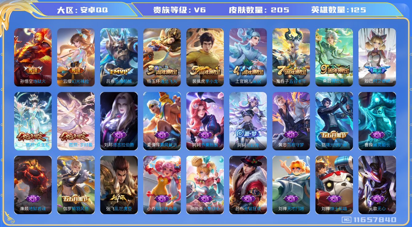 [11657840]V6 6传说 125英雄 205皮肤 可修改实名 优质装备:地狱火,涂山容容 传说皮:幻光神枪 珍宝阁皮:优雅恋人,蔷薇恋人 限定皮:愿照·岁时盈(虞姬年限),愿照·众生和(妲己年限),鸣野蒿,时之彼端,遇见飞天,怒海麟威,五谷丰年,梁祝,李小龙 史诗皮:化蝶舞,百相守梦-黄忠,特工魅影,千年之狐,偶像歌手,乱世虎臣,节奏热浪,女仆咖啡,摇滚巨星,水果甜心,绅士熊喵,天才门将,星夜王子,心灵骇客,功夫厨神,德古拉伯爵,暗隐猎兽者,幽灵船长,鬼剑武藏,心灵战警,地狱岩魂,诗语江南,繁星吟游(呼啦呼啦),缤纷独角兽,乘风破浪,水晶猎龙者,曙光守护者,箭羽风息,圣诞狂欢,圣诞恋歌,鹰眼统帅,魅力维加斯,无心,未来纪元-赵云