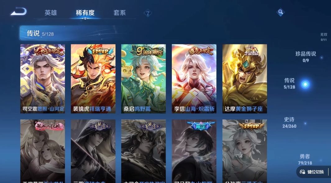 - [11624873]V0 1典藏 2传说 124英雄 183皮肤 可修改实名 优质装备:弑枪猎影(韩信典藏),超时空战士-狄仁杰 珍宝阁皮:妄想食味,万物之道 限定皮:逐霄战戟,鸣野蒿,五谷丰年,李小龙 史诗皮:化蝶舞,星界战将,蒙犽顽岩魄,蔬乡物语(鲁班七号),百相守梦-百里守约,百相守梦-黄忠,织梦人,紫霞仙子,黄金分割率,千年之狐,江河有灵,百解令(蒙犽),高渐离燃音魔法,无限星赏官,偶像歌手,电玩·爆裂旋风,末日机甲-吕布,乱世虎臣,节奏热浪,修罗,女仆咖啡,水果甜心,绅士熊喵,天才门将,星夜王子,暗隐猎兽者,幽灵船长,鬼剑武藏,舞动绿茵,地狱岩魂,缤纷独角兽,逐浪之夏,水晶猎龙者,曙光守护者,金属风暴,原初追逐者,鹰眼统帅,暗夜贵公子,魅力维加斯