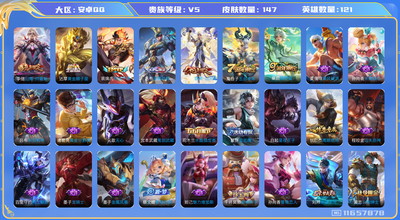 [11657878]V5 5传说 121英雄 147皮肤 可修改实名 优质装备:黄金狮子座,山海·炽霜斩(李信年限) 传说皮:祥瑞亨通 珍宝阁皮:胡桃夹子,蔷薇恋人 限定皮:愿照·山河定(司空震年限),逐霄战戟,鸣野蒿,五谷丰年 史诗皮:蒙犽顽岩魄,黄金分割率,特工魅影,龙骑士(小龙虾),末日机甲-吕布,水果甜心,星夜王子,功夫厨神,鬼剑武藏,繁星吟游(呼啦呼啦),乘风破浪,水晶猎龙者,金属风暴,鹰眼统帅,魅力维加斯,无心
