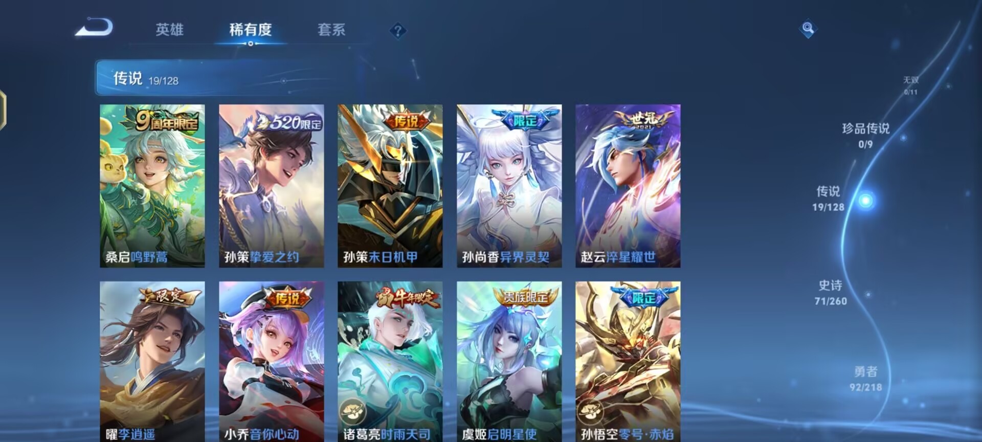 伽罗天狼溯光者,苏烈玄武志,张飞虎魄,干将莫邪冰霜恋舞曲,孙尚香异界灵契,诸葛亮时雨天司,公孙离玉兔公主,裴擒虎李小龙,裴擒虎天狼狩猎者,东皇太一逐梦之光,上官婉儿梁祝,花木兰青春决赛季,桑启鸣野蒿,猪八戒猪悟能,孙悟空孙行者,孙悟空大圣娶亲,孙悟空至尊宝,孙悟空美猴王,百里玄策白虎志,马超神威,妲己时之彼端,韩信飞衡,百里守约朱雀志,关羽冰锋战神
