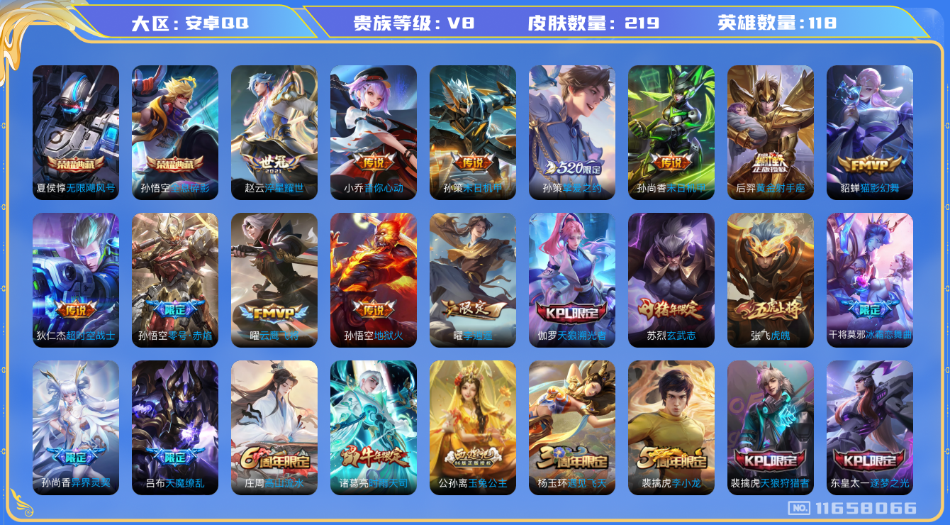 [11658066]V8 2典藏 19传说 118英雄 219皮肤 可修改实名 优质装备:无限飓风号(高达),全息碎影(猴子典藏),黄金射手座,云鹰飞将(小将军),猫影幻舞,末日机甲-孙尚香(绿蚂蚱),地狱火,音你心动-小乔,零号·赤焰,李逍遥,淬星耀世,超时空战士-狄仁杰,末日机甲-孙策,挚爱之约 珍宝阁皮:女武神 限定皮:鸣野蒿,至尊宝,白虎志(电光耗子),凤求凰(白切鸡),异界灵契(白毛香),时之彼端,时雨天司(水龙头),神威(电光马子),飞衡(韩信年限),遇见飞天,高山流水,冰锋战神,梁祝,天狼狩猎者,天狼溯光者,虎魄,李小龙,逐梦之光,玄武志(苏烈年限),朱雀志(守约年限),孙行者,猪悟能,大圣娶亲,天魔缭乱,青春决赛季,冰霜恋舞曲,美猴王,玉兔公主 史诗皮:紫霞仙子,苍穹之光,电玩小子(小书包),黄金分割率,特工魅影,千年之狐,魅语,无限星赏官,冰冠公主,偶像歌手,晚萤,龙骑士(小龙虾),猫狗日记-孙策,修罗,女仆咖啡,水果甜心,星夜王子,功夫厨神,德古拉伯爵,幽灵船长,鬼剑武藏,心灵战警,舞动绿茵,地狱岩魂,繁星吟游(呼啦呼啦),缤纷独角兽,乘风破浪,水晶猎龙者,曙光守护者,金属风暴,原初追逐者,圣诞狂欢,圣诞恋歌,鹰眼统帅,王者之锤,魅力维加斯,黎明之约