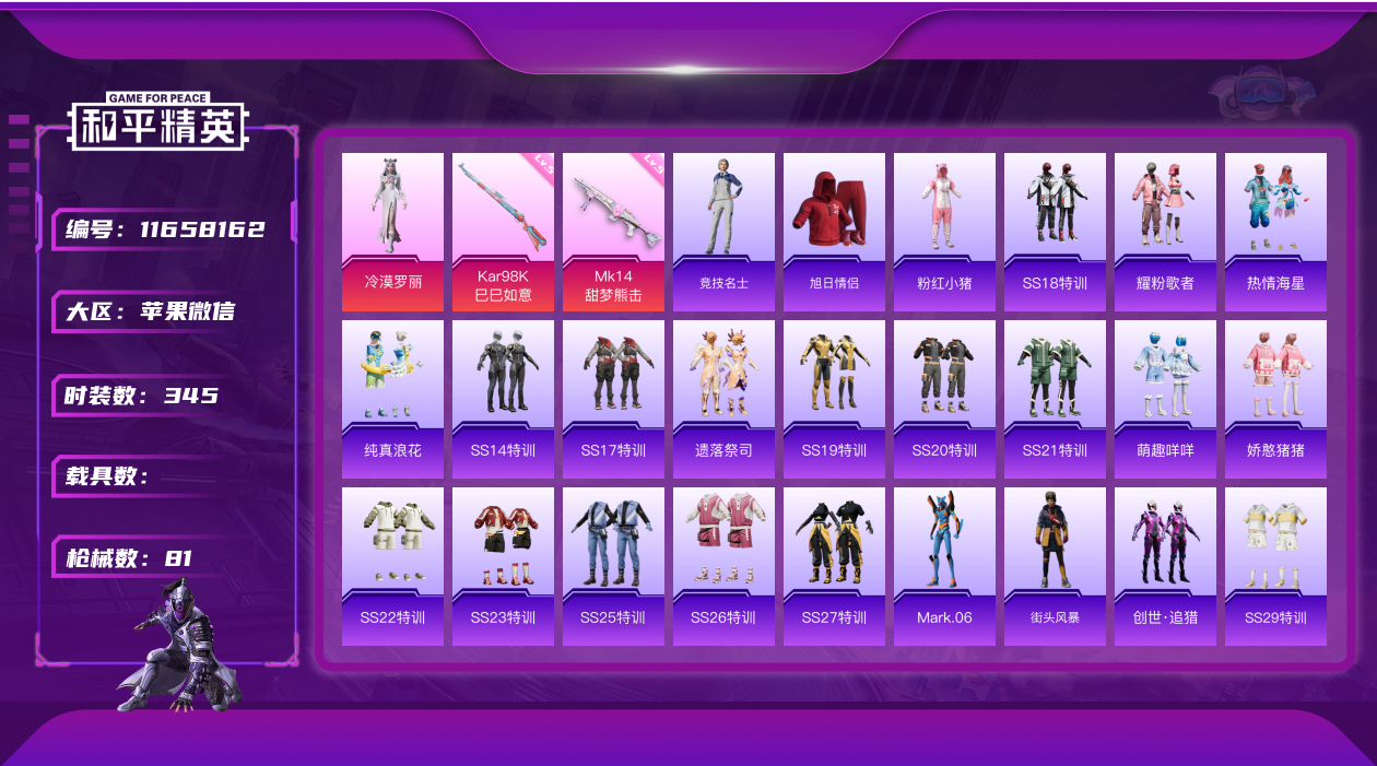- PX_2077908- 苹果手Q-4王牌印记-7粉装-5特效枪-1载具-26188热力值-46套装-86枪皮-2卓越印记-2传奇印记 【7粉装】,初号机 觉醒Ver.,放客神游,怪诞乔克,星穹咏叹调,凤凰座 一辉,宙之时溯,萨利娅 【5特效枪】SCAR-L-万古烈焰-3级 M416-女娲灵识-3级 Kar98K-巳巳如意-5级 AMR-智耀战神-4级 MK12-雪月幻音-4级 【3稀有紫装】,M