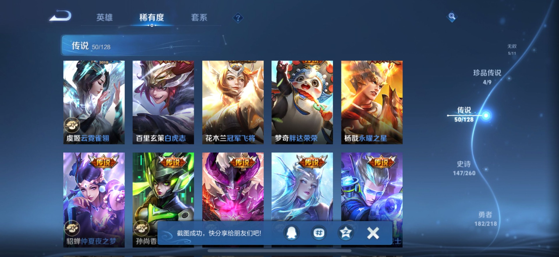 - PX_2096153-37 安卓QQ/尊贵铂金/203皮肤/125英雄/1典藏/0珍品无双/0无双/0珍品传说/25传说/49史诗/9稀有英雄 【1 典藏皮肤】银白咏叹调 铠, 【25 传说皮肤】启明星使 虞姬,云霓雀翎 虞姬,逐花归海 澜,零号·赤焰 孙悟空,云鹰飞将 曜,深海之息 马可波罗,诗剑行 李白,仲夏夜之梦 貂蝉,惊梅引 宫本武藏,鹤羽星尊 诸葛亮,炽阳神光 镜,霜月吟 露娜,时之奇旅