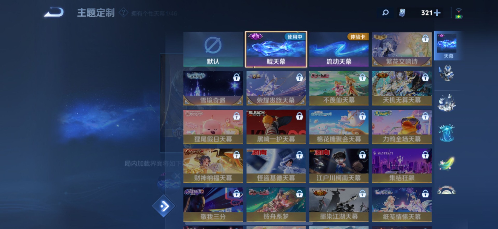 刘邦夺宝奇兵,老夫子醍醐杖,沈梦溪星空之诺,盾山御銮,曹操烛龙,苏烈千军破阵,典韦穷奇,典韦蓝屏警告,达摩沙漠行僧,牛魔御旌,项羽苍威无极,鲁班七号狮舞东方,吕布猎兽之王,镜青焰无极,元歌云间偶戏,兰陵王金庭之子,鲁班大师探海日志,明世隐疑决卦,蒙犽狂想玩偶喵,马可波罗暗影游猎,鬼谷子原初探秘者,张良古海寻踪,女娲朔望之晖,狄仁杰万华元夜,嬴政白昼王子,芈月重明,程咬金演武夺筹,李元芳银河之约,李元芳云中旅人,米莱狄御霄,钟馗神迹守卫,狂铁御狮