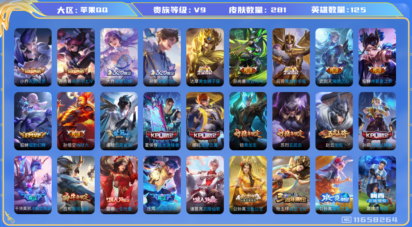 - [11595863]V8 1典藏 1无双 3珍品传说 19传说 125英雄 253皮肤 可修改实名 优质装备:无限飓风号(高达),天机白泽,怪盗基德,朽木白哉,黑崎一护,黄金狮子座,云鹰飞将(小将军),炽阳神光,胖达荣荣,超时空战士-狄仁杰,妄想实况,澜逐花归海,诡秘之主,涂山容容 传说皮:乘龙·铭钟鼎(赵云年限),典韦战鼓燎原,九山相柳 珍宝阁皮:玩趣恶龙 限定皮:愿照·九州拓(澜年限),愿照·山河定(司空震年限),鸣野蒿,凤求凰(白切鸡),飞衡(韩信年限),影龙天霄,诗剑行,五谷丰年,梁祝,御风骁将(吕布年限),李小龙,永曜之星,辉光之辰,如梦令-后羿,孙行者,美猴王,山海·玄木吟(马可年限) 史诗皮:鸭鸭历险记-刘禅,器灵·浮梦炉,灵蛊蚀心,星界战将,龙之律动,石田雨龙,百相守梦-周瑜,茶境仙,埋骨钱,百相守梦-百里守约,紫霞仙子,苍穹之光,电玩小子(小书包),黄金分割率,特工魅影,千年之狐,江河有灵,高渐离燃音魔法,蒙恬荣光圣徽,偶像歌手,暗夜猫娘,猫狗日记-孙策,乱世虎臣,摇滚巨星,水果甜心,绅士熊喵,星夜王子,德古拉伯爵,鬼剑武藏,暗渊魔法,天秀·启明,纤云弄巧,缤纷独角兽,乘风破浪,逐浪之夏,水晶猎龙者,曙光守护者,金属风暴,原初追逐者,圣诞狂欢,圣诞恋歌,鹰眼统帅,暗夜贵公子,魅力维加斯,黎明之约,未来纪元-赵云